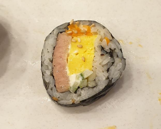 스팸 김밥은 짭짤한 맛인 스팸이 들어있어서 맛있었습니다. 다만 스팸이 많아서 그런지 좀 간이 쌔서 짜다고 느끼는 사람도 있을 것 같습니다. 저번에도 느꼈지만 간이 쌔서 제가 별로 안 좋아