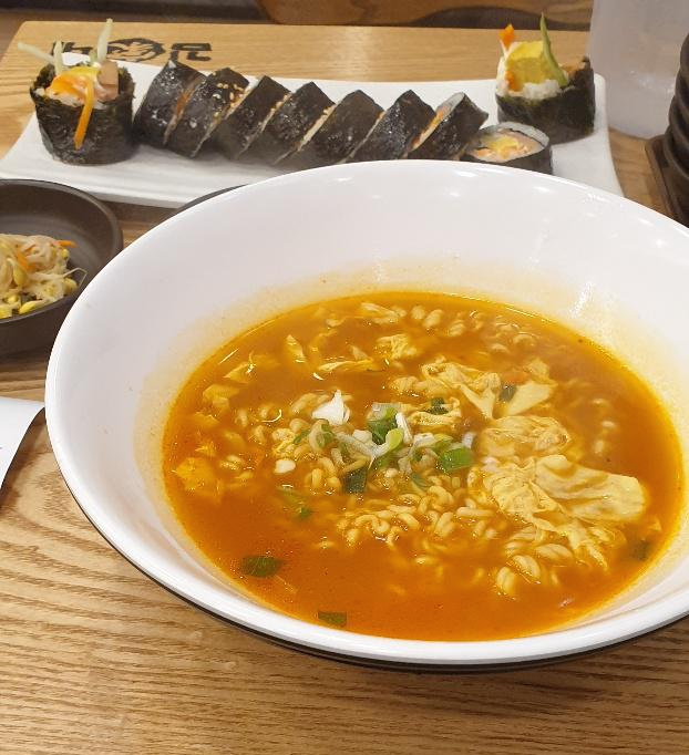 스팸 김밥과 라면을 주문했는데 회사가 많아서 그런지 점심에 정신이 없더군요... 키오스크에서 주문하면 번호가 나오는데 화면의 번호는 뭔가 반영이 느린 거 같고, 주문한 음식은 원래는 손님이 번호보고받는 거 같은데 점심이라 그런지 직접 가져다준다고 자리에 있으라고 하시더군요. 반찬도 그렇고... 계속 뭐 주문하셨냐고 물어보시면서 서빙을 하셔서 정신이 없어 보였어요.