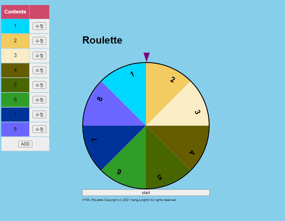 1 2 3 4 5 6 7 8 start HTML Roulette Copyright (c) 2021 KangJungMin All rights reserved.