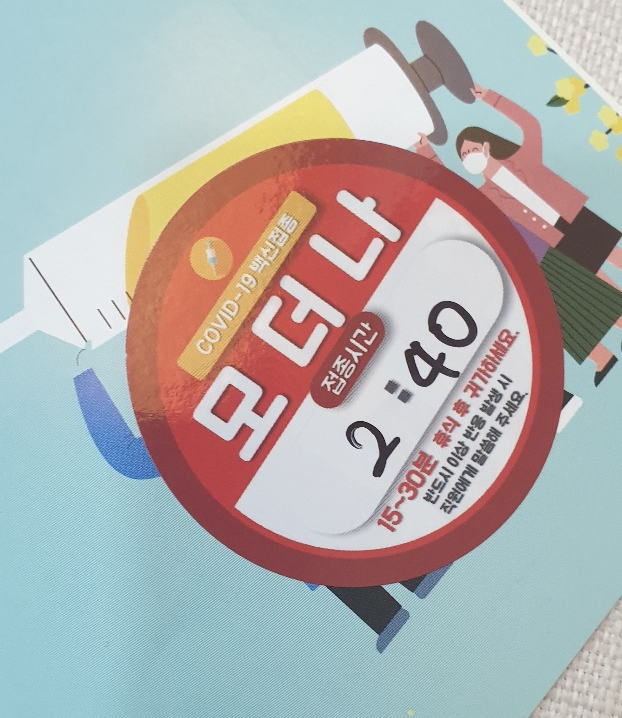 벽 쪽은 빈자리가 없어서 카운터 앞쪽에서 대기하다가 운 좋게 간호사들이 2시에 문진표를 받기 시작하면서 얼떨결에 제가 줄의 앞이 된 느낌으로 앞쪽에 배정돼서 2시 25분쯤에 모더나를 접종했습니다.