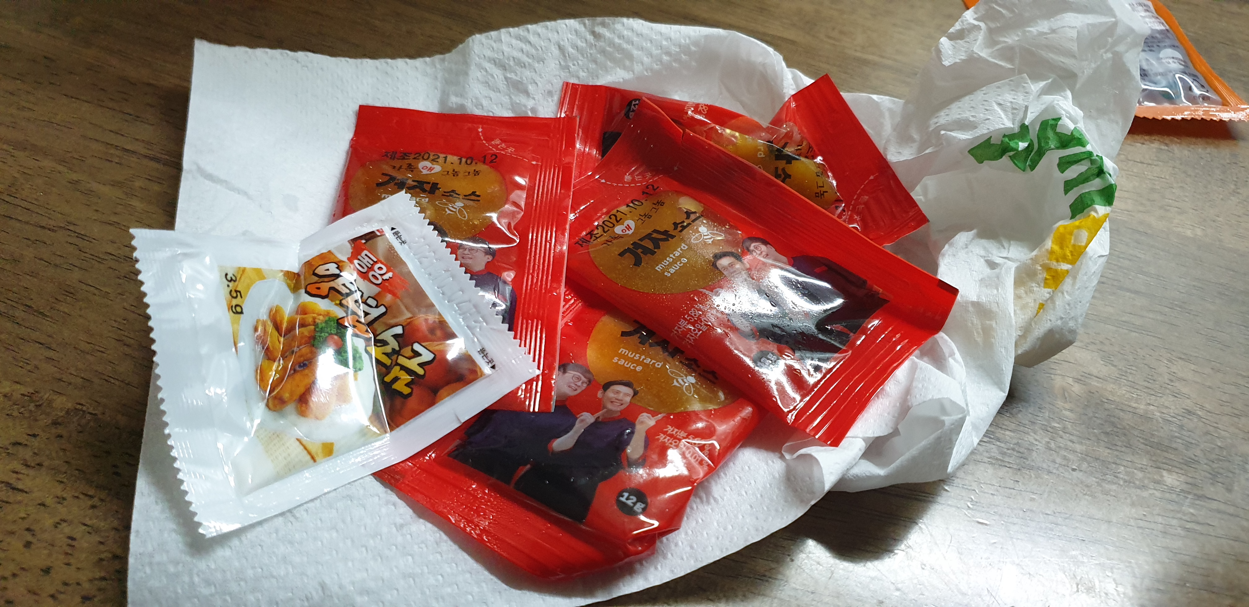 닭과 소금, 겨자소스 4개가 들어있었어요. 기름이 너무 많아서 겨자소스와 소금도 미끌거렸습니다.