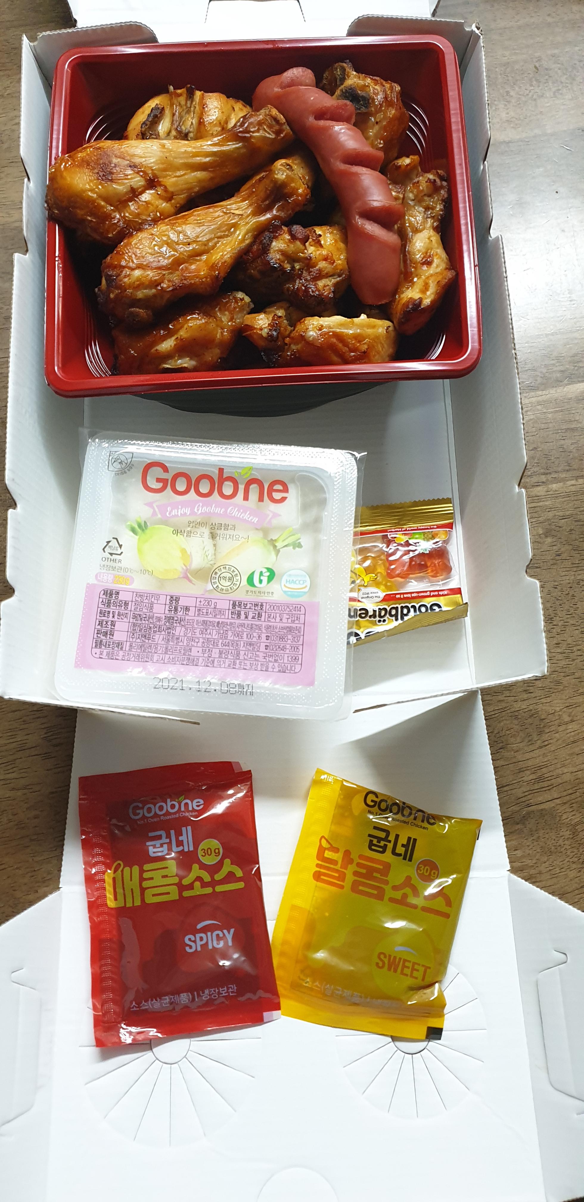 굽네치킨 오리지널은 신기하게 소시지가 하나 들어있더군요. 맛은 약간 싸구려? 소시지 느낌이었습니다. 약간 길거리 포장마차 핫도그 소시지 느낌? 그리고 소스 두 개와 하리보 젤리, 치킨무가 들어있네요.