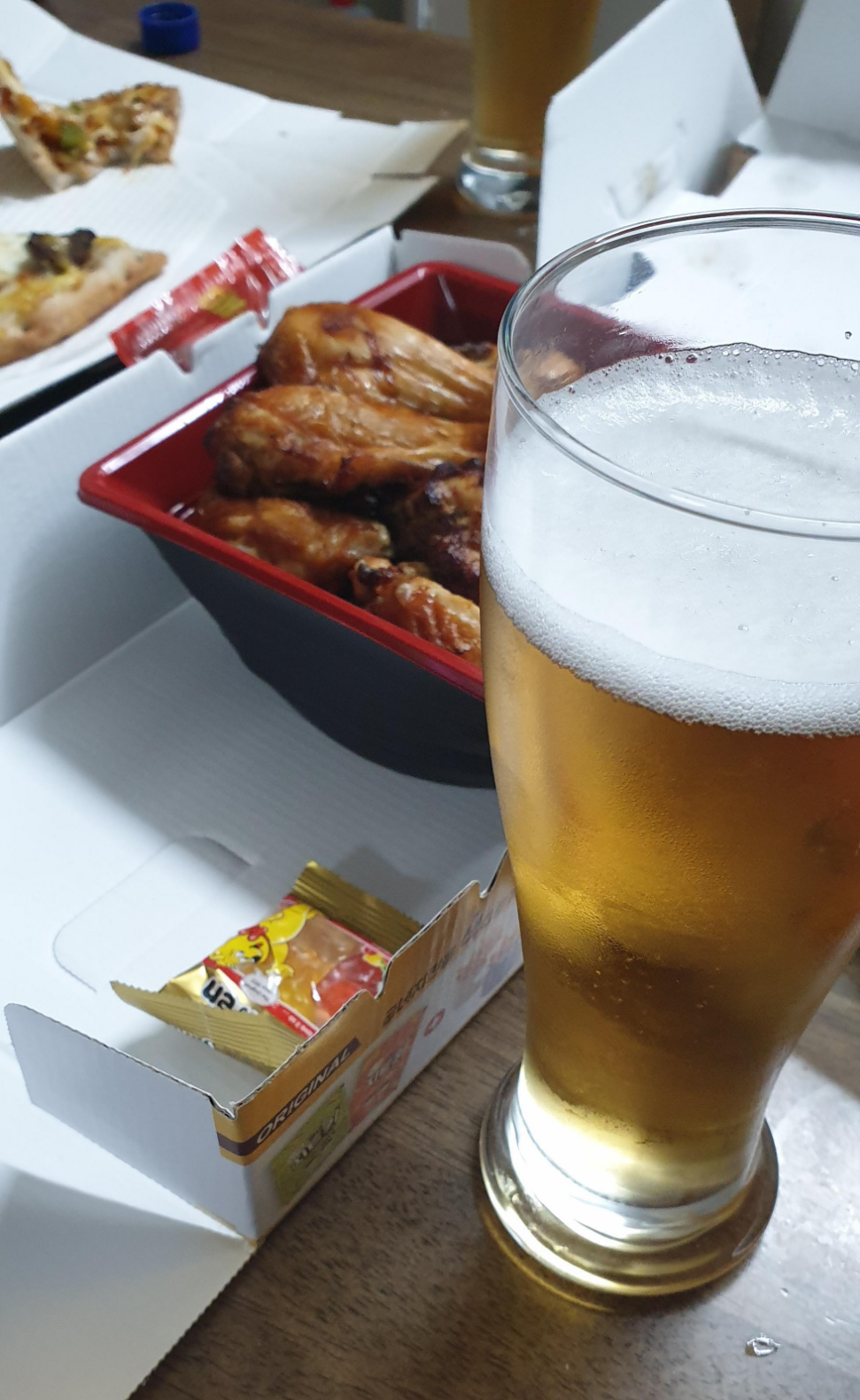 맨날 튀긴 치킨 먹다가 구운 치킨 먹으니 더 맛있게 느껴지더군요. 구운 치킨이라 양념하고 더 잘 어울리는 것 같기도 하고 맥주랑 먹으니 더 맛있더군요.