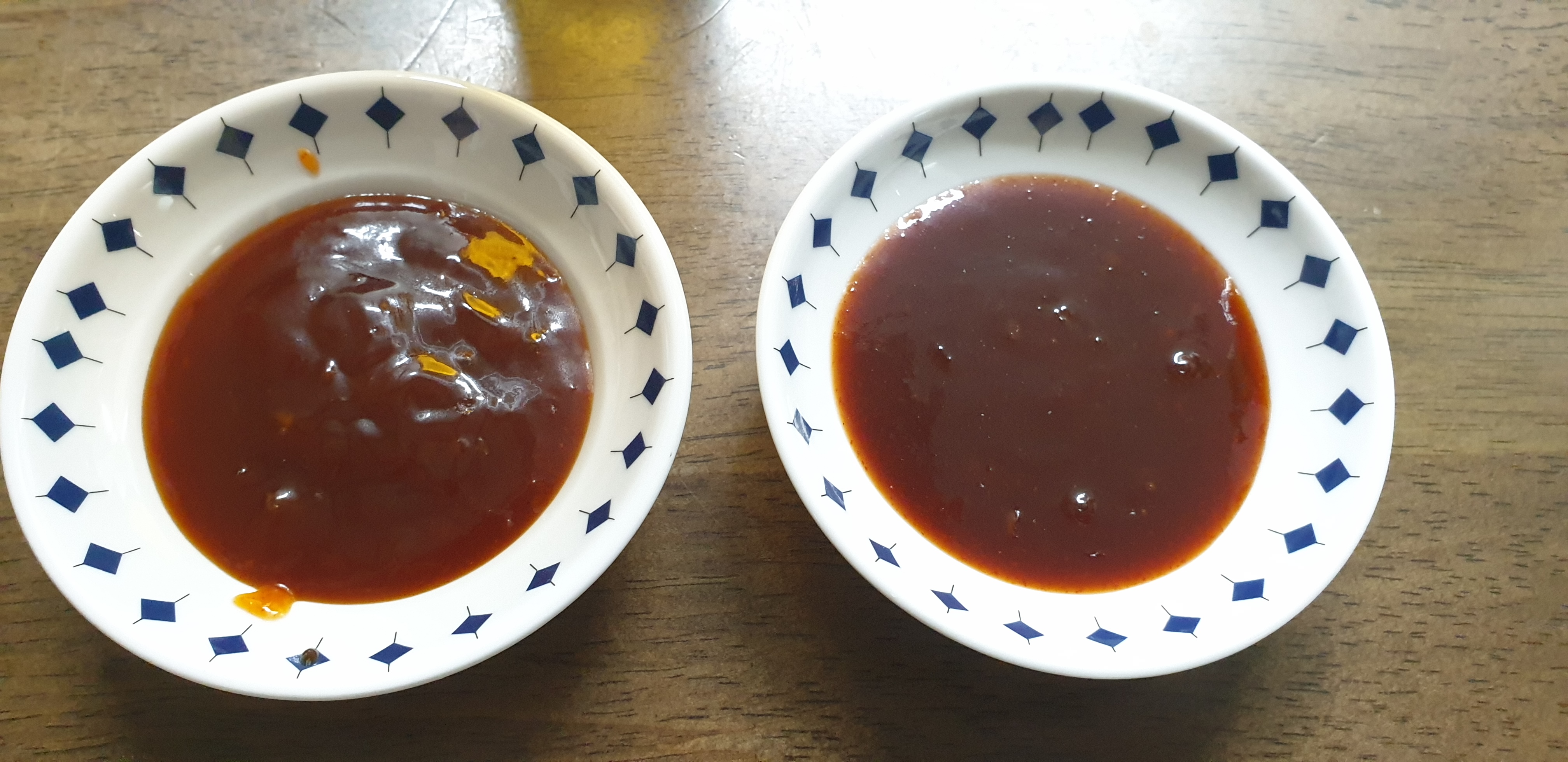 왼쪽이 달콤 소스 오른쪽이 매콤 소스입니다.