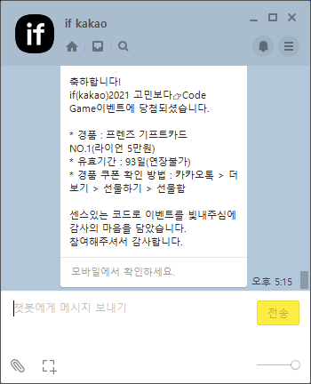 어쨌든 if(kakao) 2021에서 Code Game을 기간 중 점심시간에 엄청 대충 해서 참가했는데 운 좋게도 당첨이 됐네요.