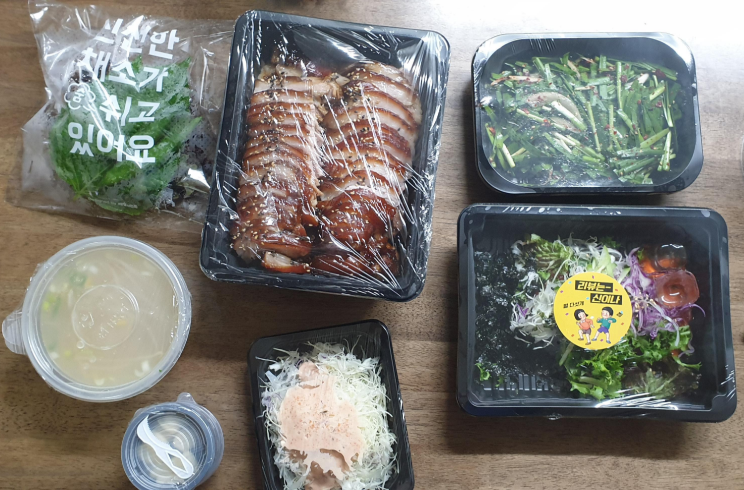 구성은 야채, 황태국, 족발, 마늘, 쌈장, 새우젓, 샐러드, 부추무침 그리고 리뷰 작성 이벤트 막국수입니다.