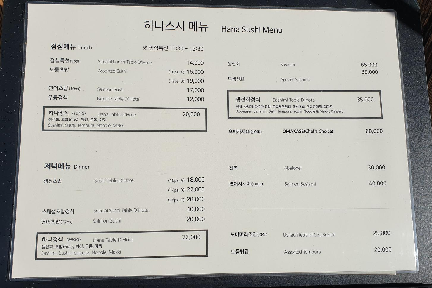 대륭 5차 쪽에 있는 하나스시에서 점심 특선을 먹었습니다. 가격은 14000원이었습니다.