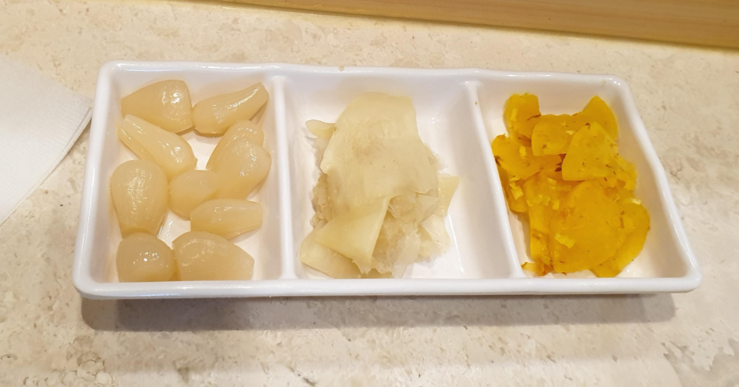 처음에는 단무지와 락교 같은 밑반찬과 샐러드, 된장국이 나오네요.