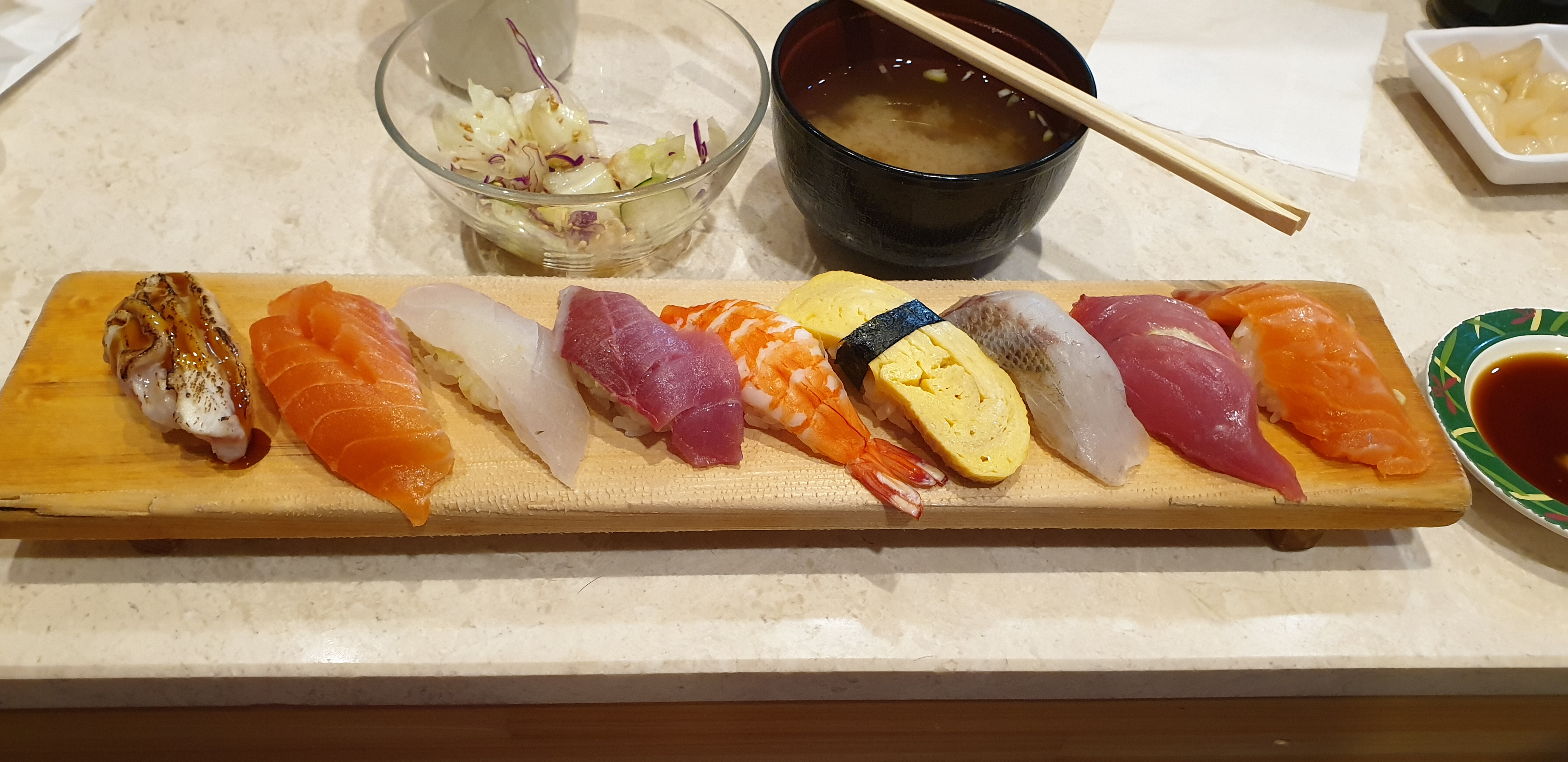 점심특선은 초밥 9개 + 우동 + 김마끼 + 샐러드 +된장국 으로 구성되어있었네요.