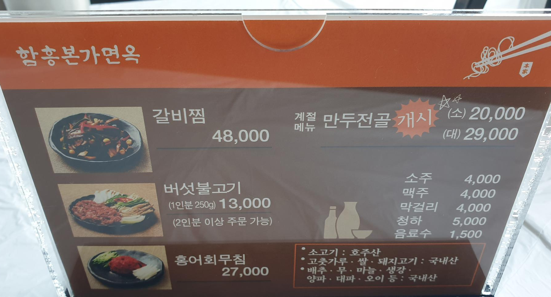 냉면 하고 석쇠불고기만 먹어봤는데 갈비찜이나 홍어회 무침도 파는군요.