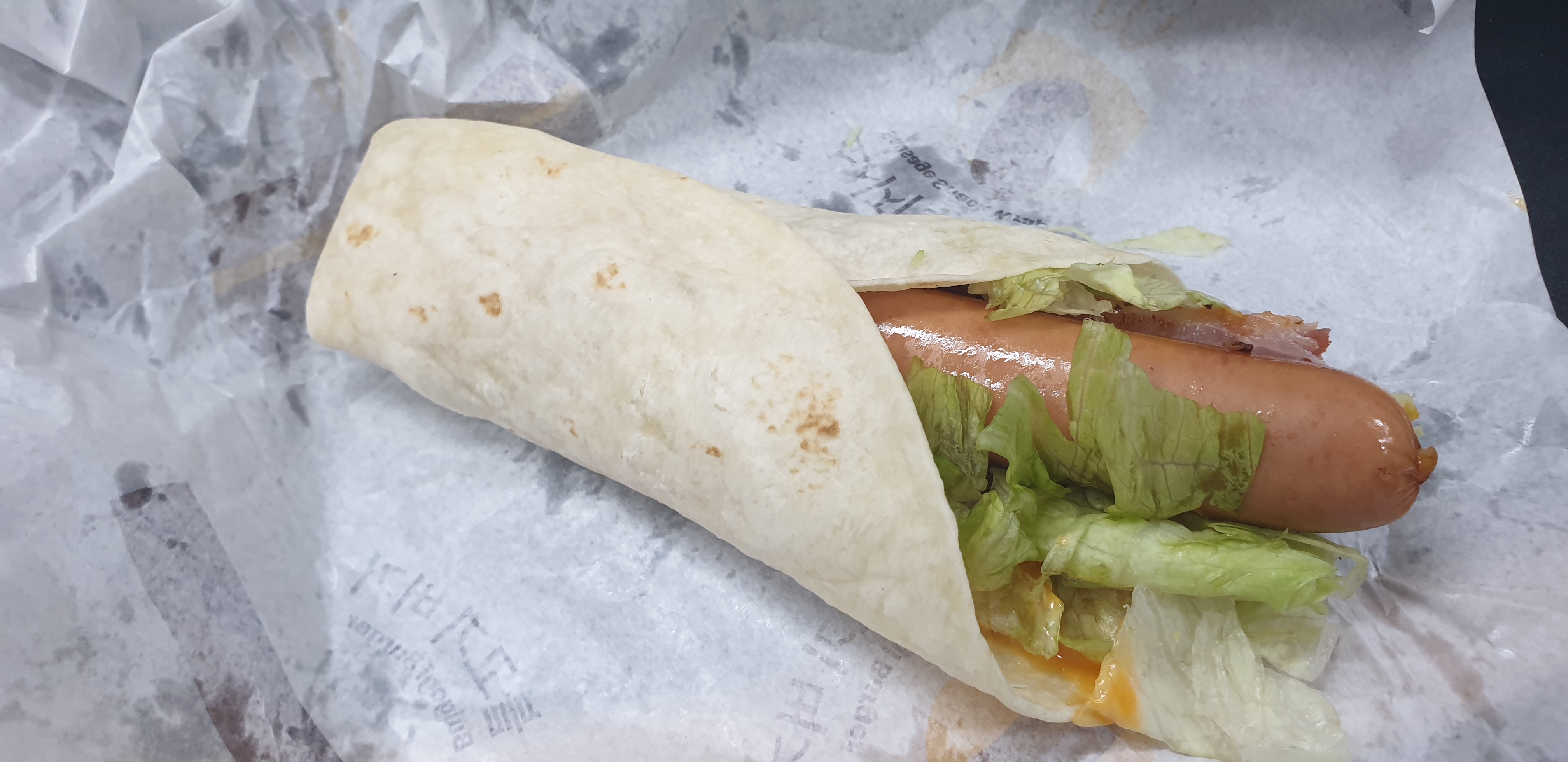 포장지를 펼치니 토르티야도 같이 펼쳐지더군요. 내용물은 소시지, 양상추, 머스터드 느낌의 소스, 그리고 베이컨 조그마한 게 있네요. 펼쳐있는 모습은 뭔가 엄청 빈약해 보이기도 합니다.