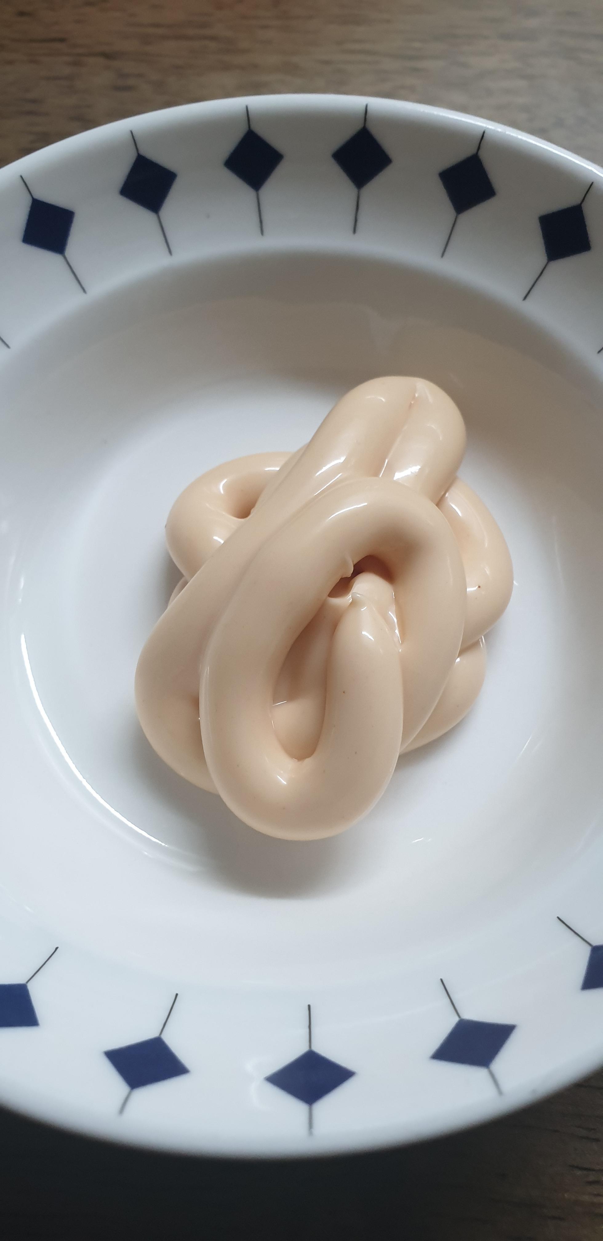 흠... 그릇에 짜 봤는데 일반 마요네즈처럼 완전 흰색은 아니지만 명란이 진짜 거의 안 보이는군요.