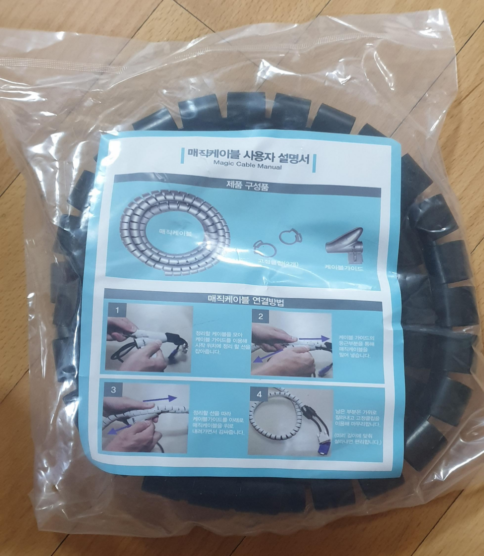 구성품은 설명서, 케이블 가이드, 고정클립 2개 그리고 매직 케이블로 구성되어있습니다.