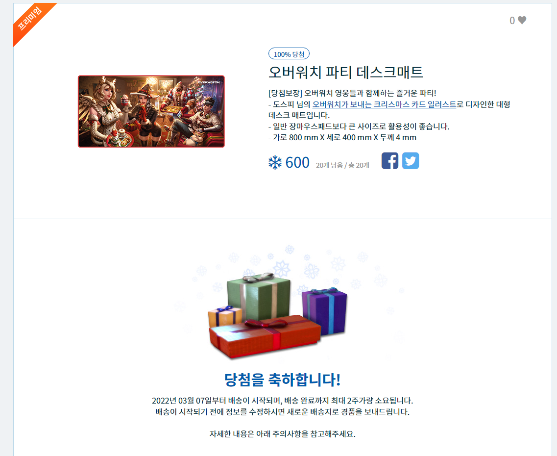 다행히도 성공해서 오버워치 파티 데스크매트가 당첨됬네요.