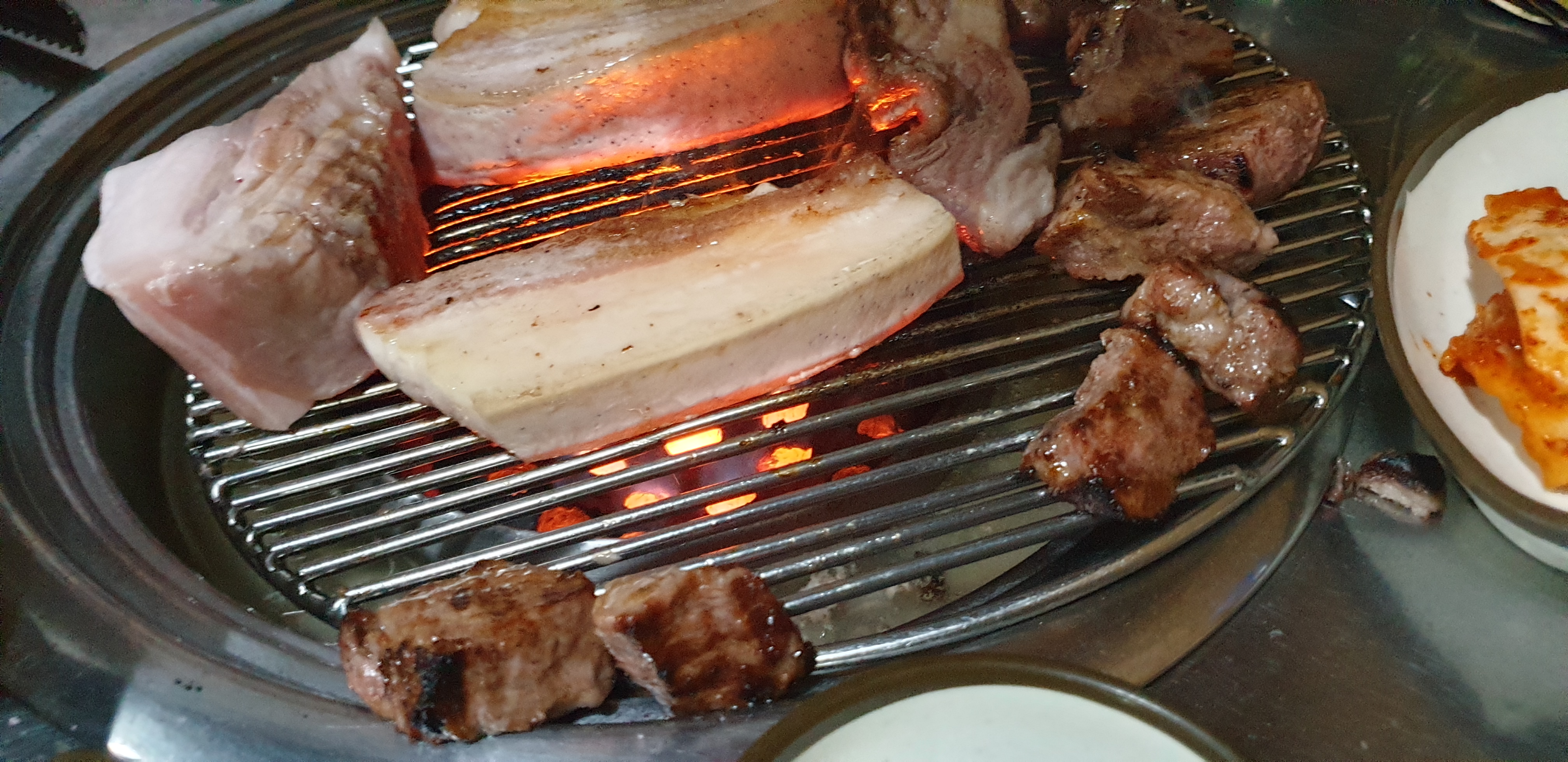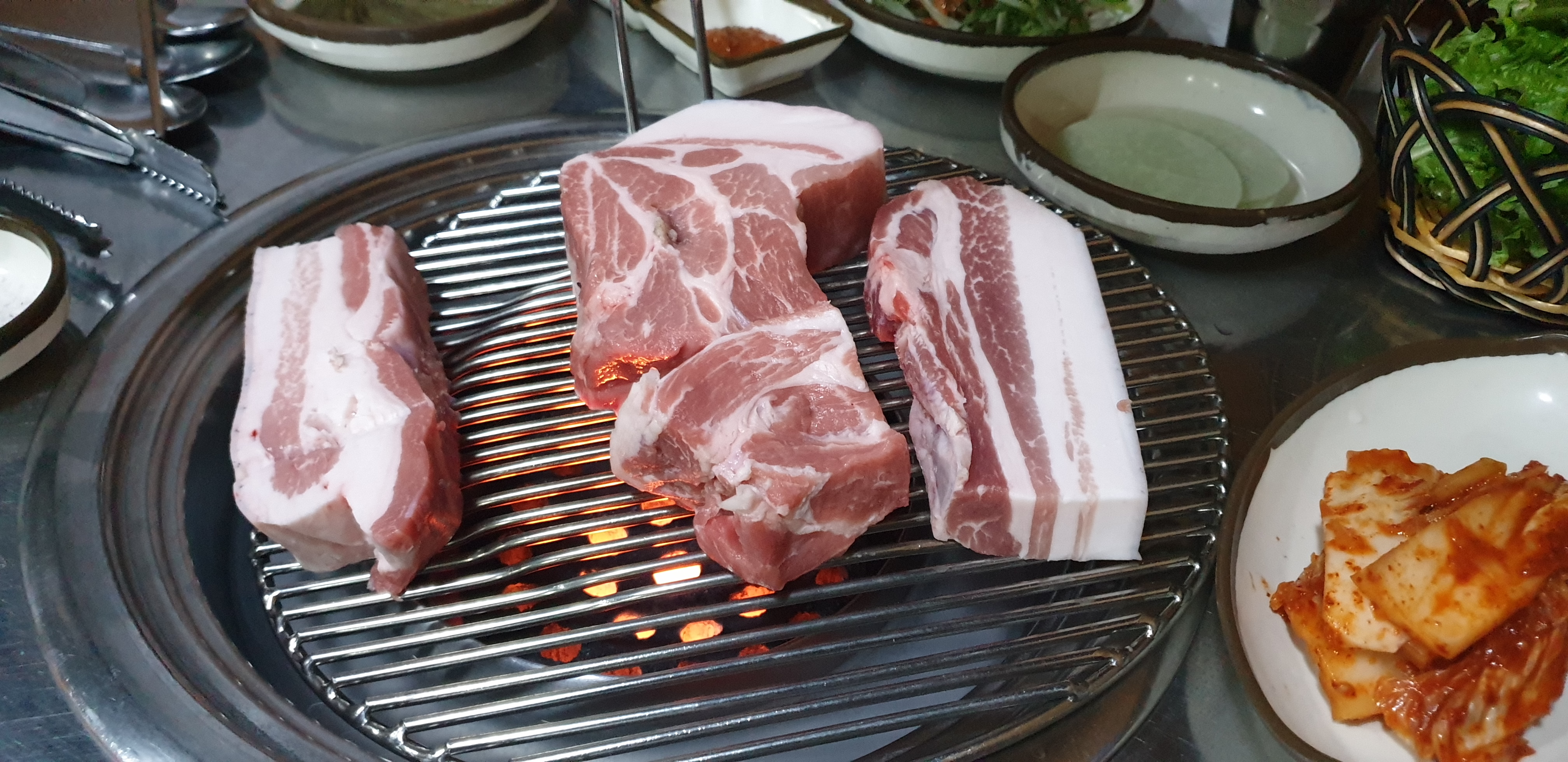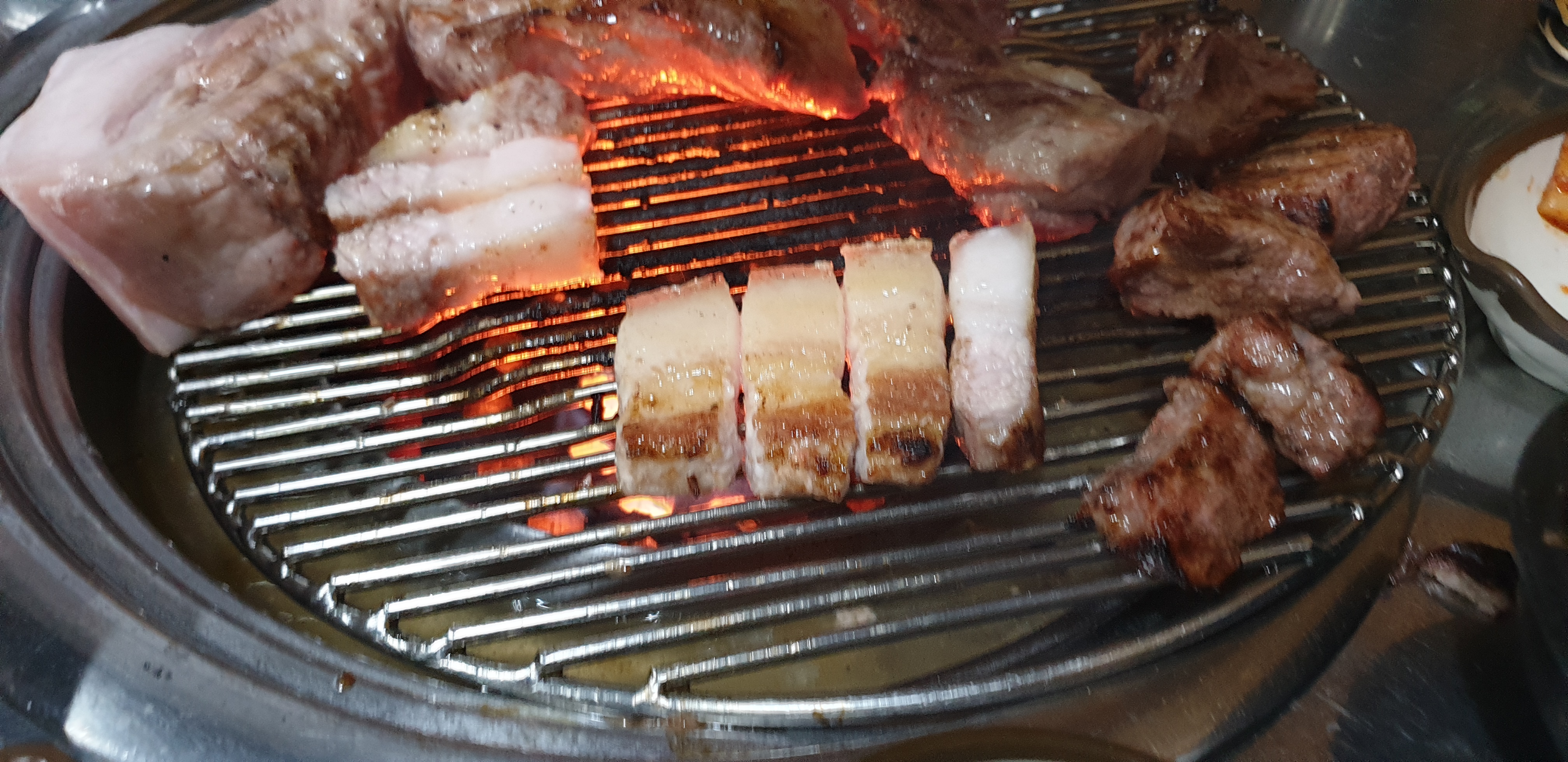 불판은 뭔가 이상하게 이미지처럼 딱 맞게 안 넣고 구워 주시더군요... 이유는 모르겠지만 저 불안하게 비스듬히 걸린 상태로 구워 먹었습니다. 판이 이상한 건지 아니면 뭔가 이유가 있는 건지... 직원분도 아무렇지 않게 저상태로 구워 주시더군요.