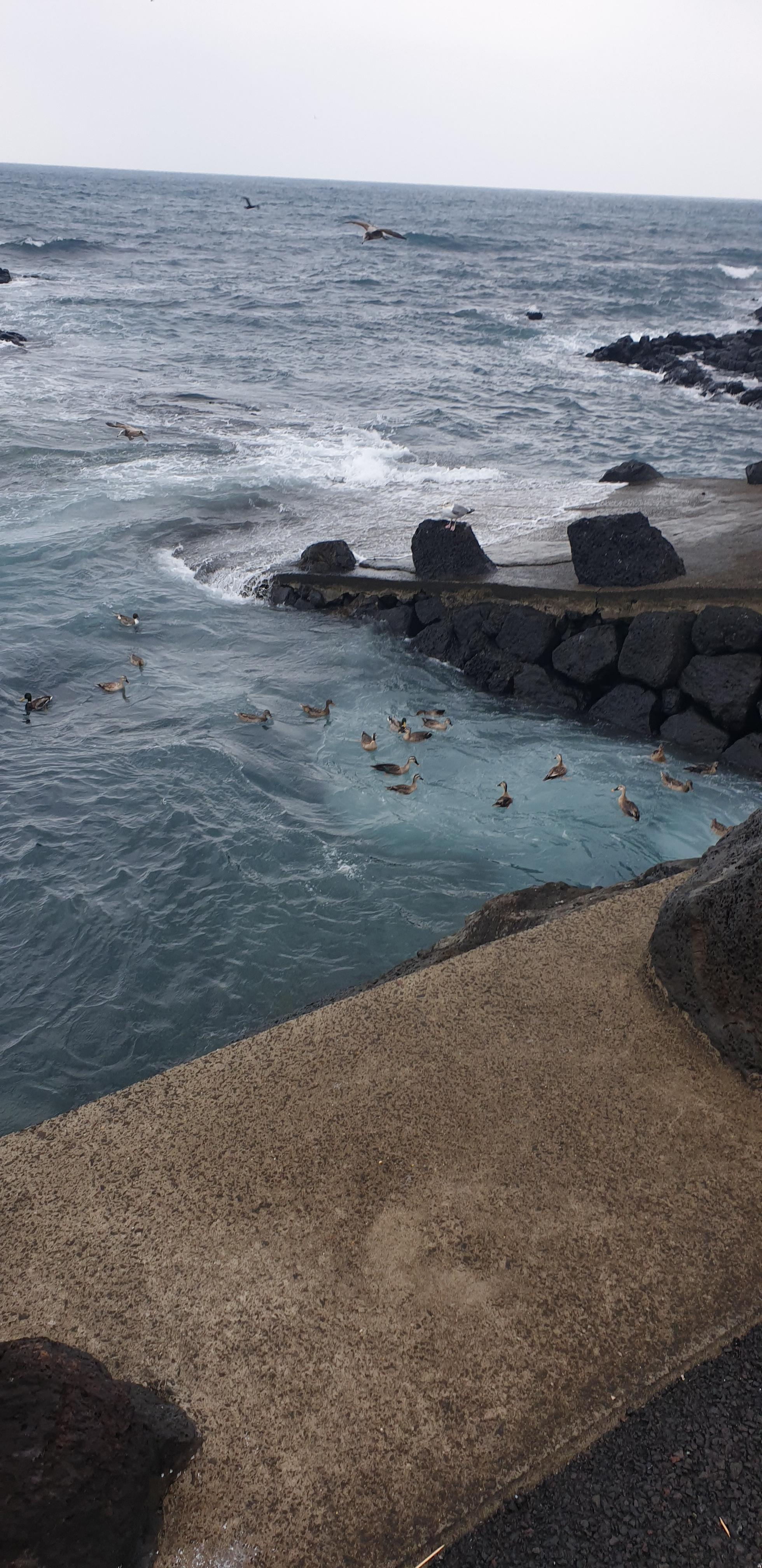 대기실도 있었지만 대기실에 사람이 많은 것 같아서 그냥 밖에서 바다 구경을 했네요. 우중충한 하늘과 미친것 같은 강한 바람... 그리고 그 바람 속에서 바람 따라 제자리에서 비행하는 갈매기... 신기하더군요. 바다에 오리가 있는 것도 신기하고...
