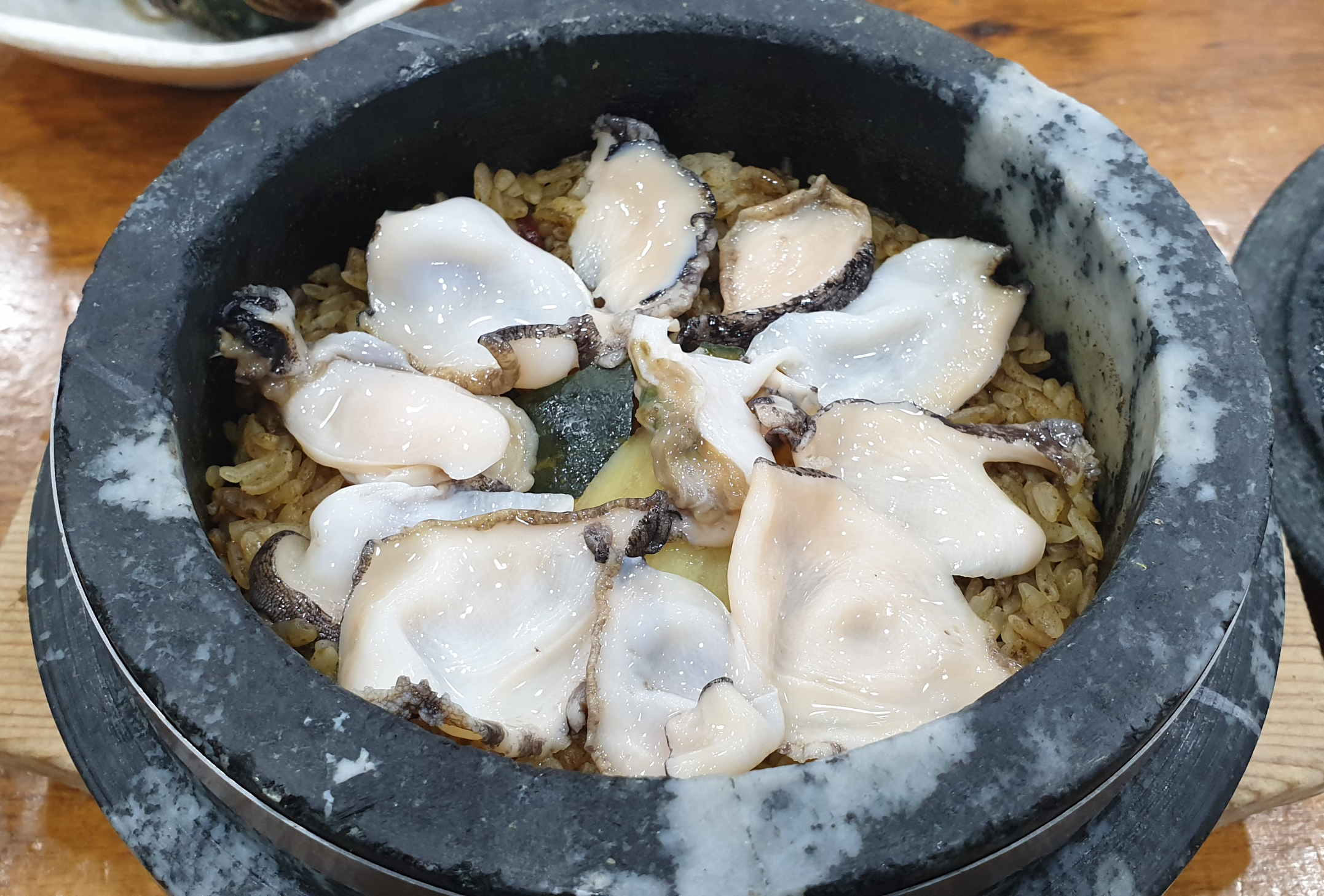 전복내장을 넣고 지은 밥 위에 전복살이 올라가 있습니다.