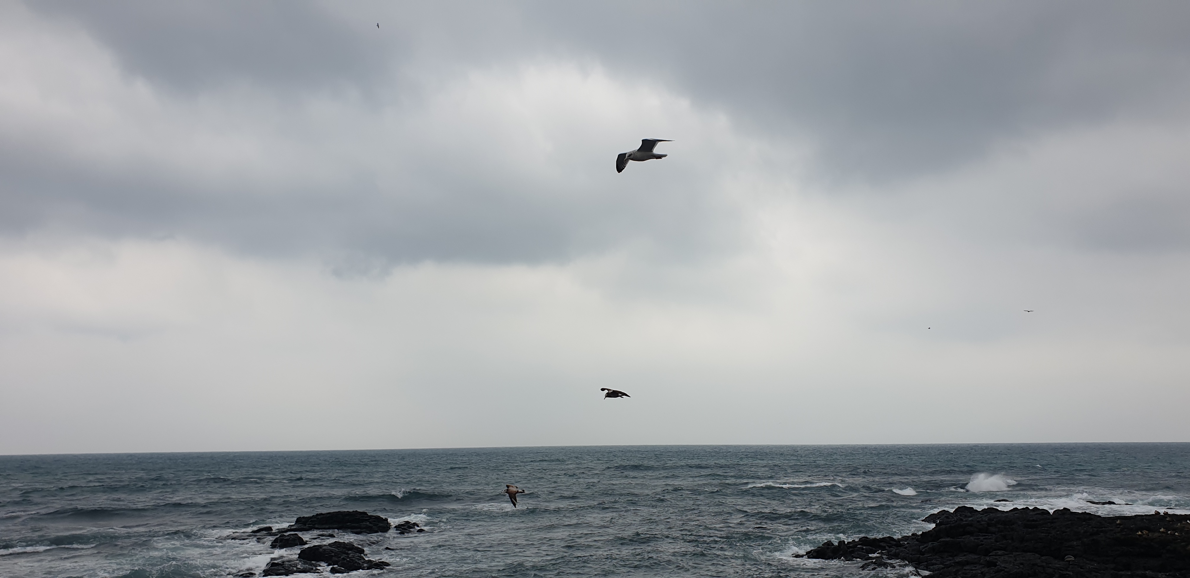 대기실도 있었지만 대기실에 사람이 많은 것 같아서 그냥 밖에서 바다 구경을 했네요. 우중충한 하늘과 미친것 같은 강한 바람... 그리고 그 바람 속에서 바람 따라 제자리에서 비행하는 갈매기... 신기하더군요. 바다에 오리가 있는 것도 신기하고...