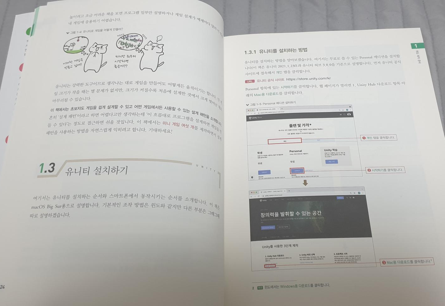 1장의 게임 제작 준비하기에서는 확실히 입문용 책이라서 그런지 앞쪽에 유니티 설명 및 유니티 설치하기부터 기초적인 부분부터 시작하네요.