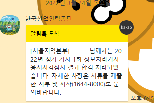 그리고 퇴근하다 보니 한국산업인력공단에서 카톡으로 결과가 왔습니다.