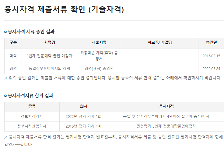 큐넷에 들어가서 마이페이지 > 응시자격 > 응시자격 제출서류 확인 (기술자격)을 가보니 동일직무분야 경력이 승인이 됐습니다. 나중에 보니 신청하고 제출하는 동안 신청했다는 메일, 완료됐다는 메일도 많이 왔더군요.