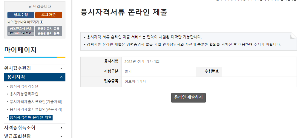 로그인 후 마이페이지 > 응시자격 > 응시자격서류 온라인 제출 메뉴에 들어오니 합격한 시험과 온라인 제출하기가 보이네요.