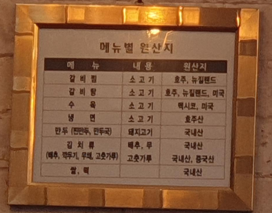 원산지 표시도 벽에 있는데 회냉면에 들어가는 회는 표기 가 없네요. 뭐 명태회겠지만요.