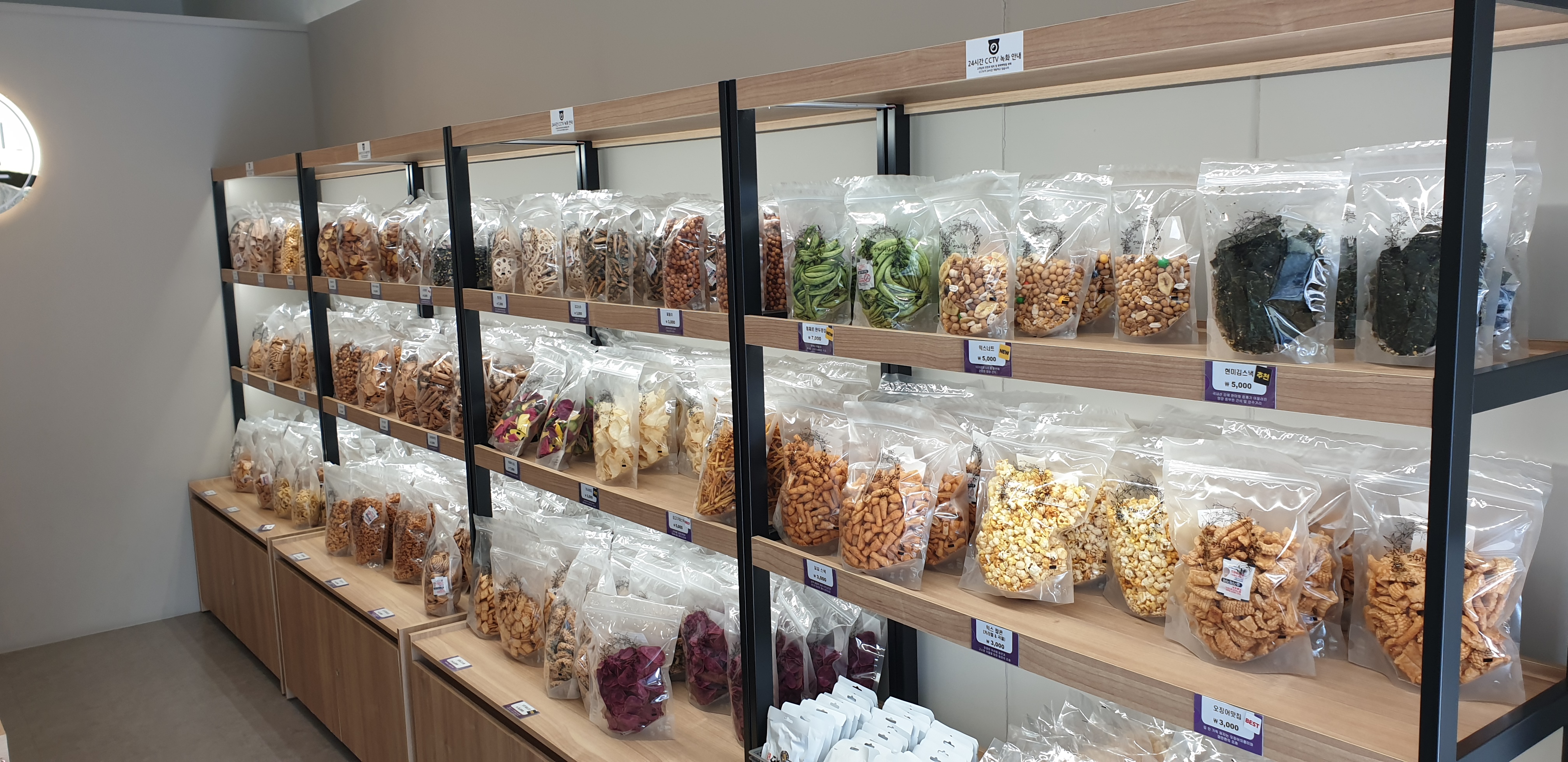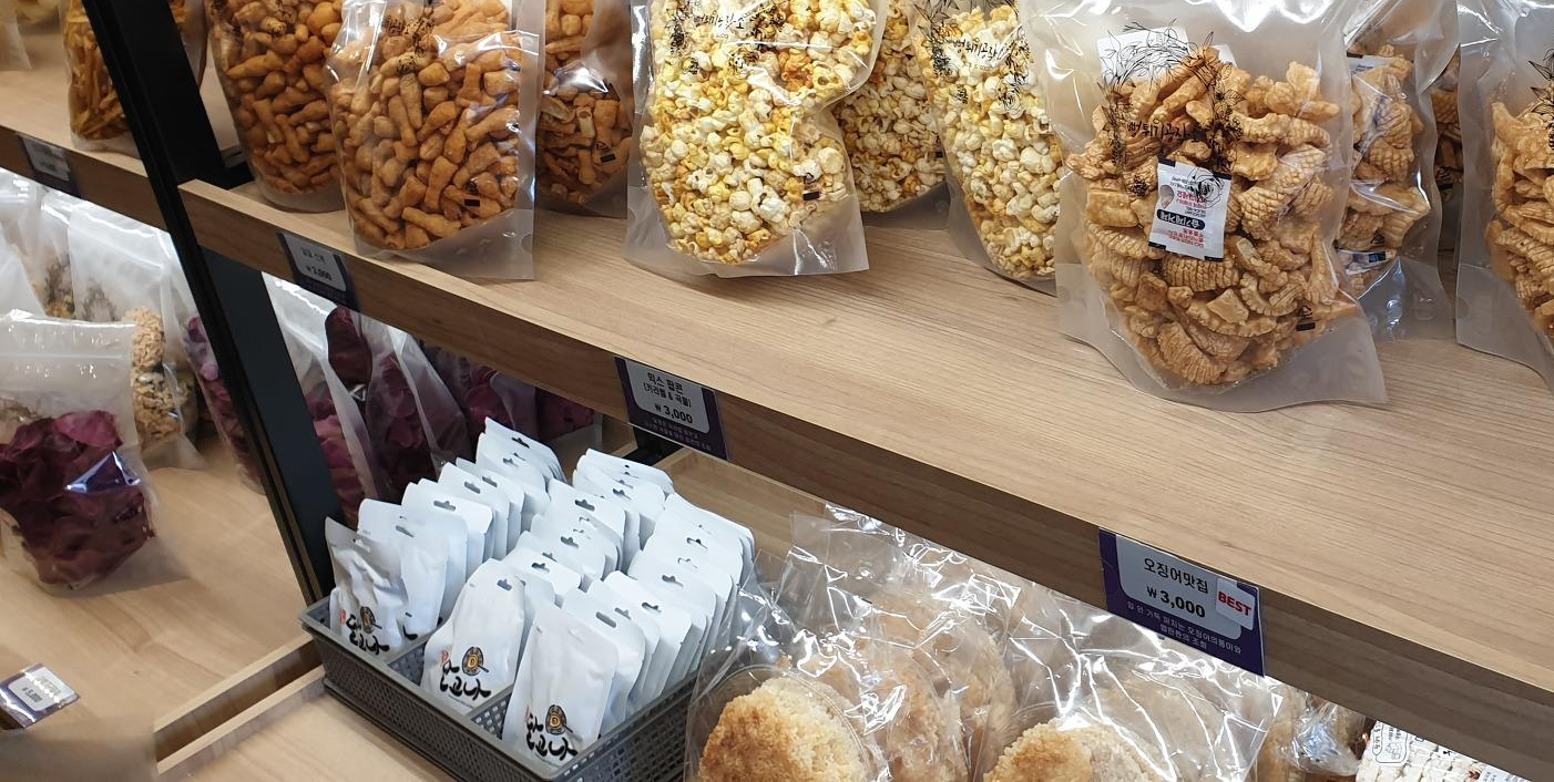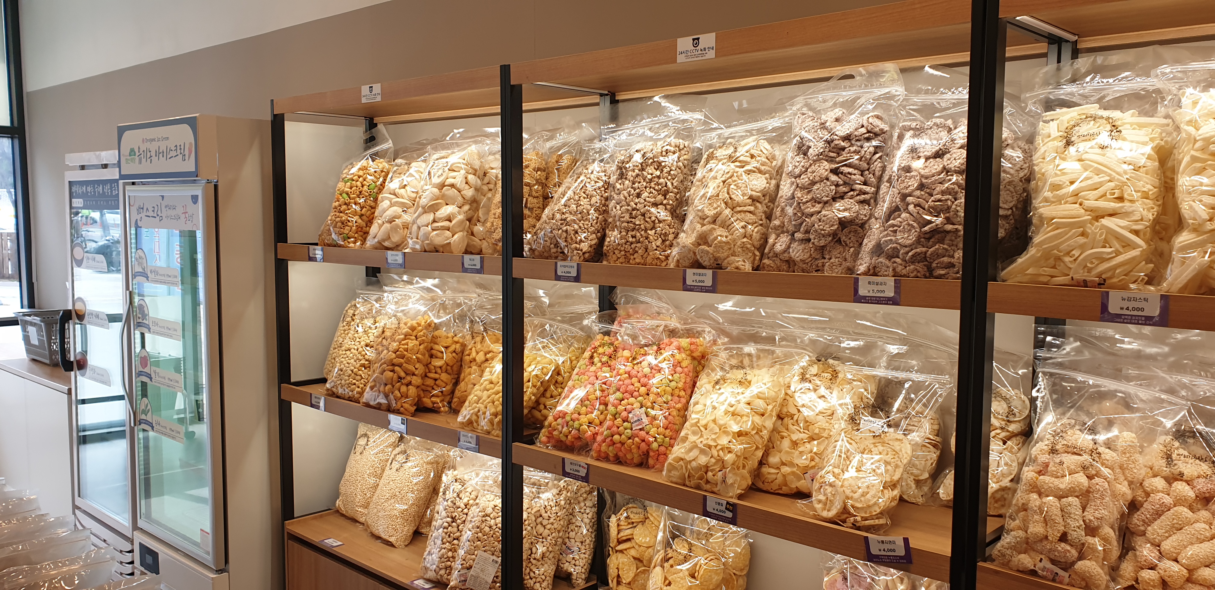 김 과자, 오징어 과자부터 깍지콩 과자도 있고 단순히 뻥튀기만 파는 줄 알았는데 다양한 웰빙 스낵을 파네요.
