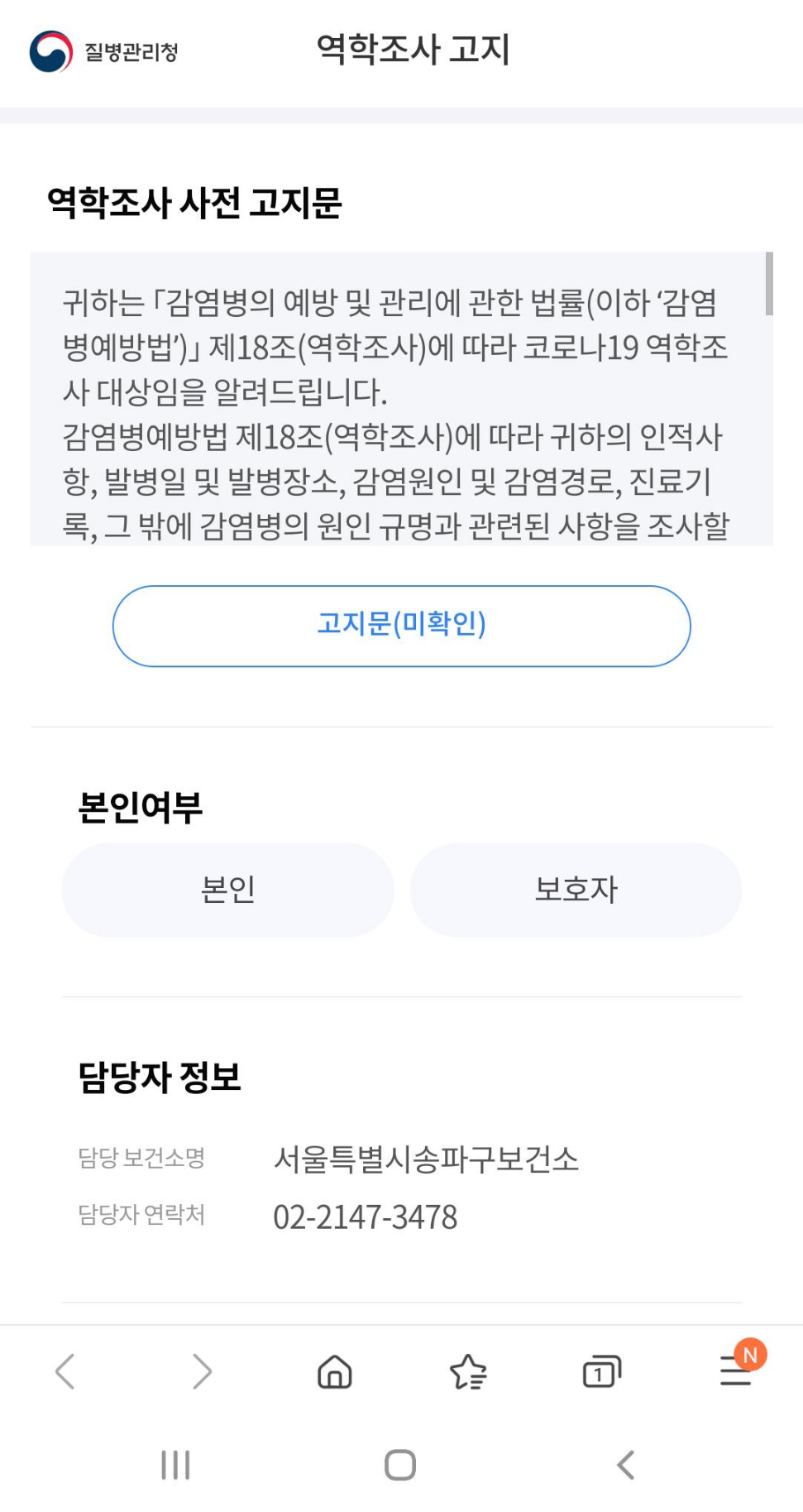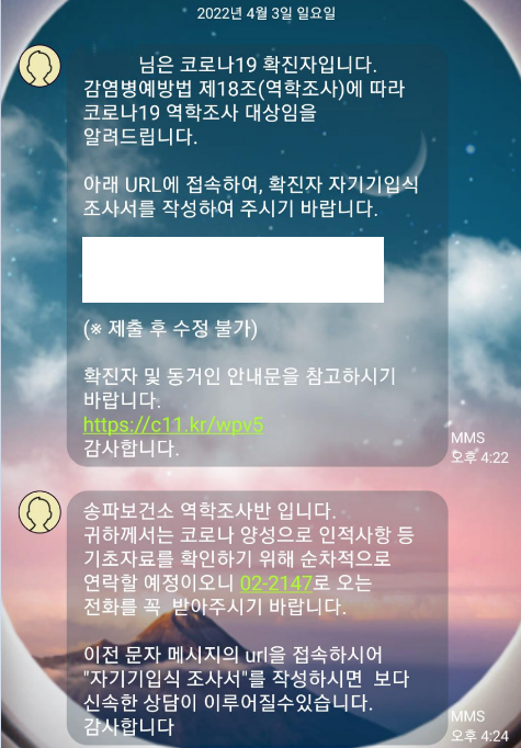 어쨌든 확정이란 소리를 듣고 병원에서 나온 시간이 2시 53분 약국 들렸다가 집에 와서 약 먹고 자다 보니 보건소에서 전화가 왔습니다. 문자로 보낸 문진표 작성을 안 해서 해달라는 전화 더군요.