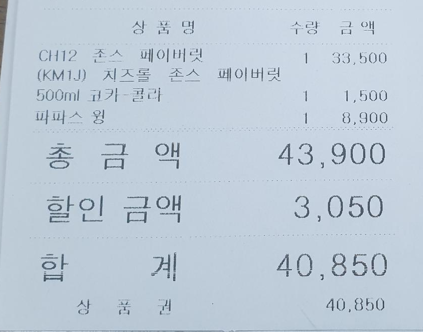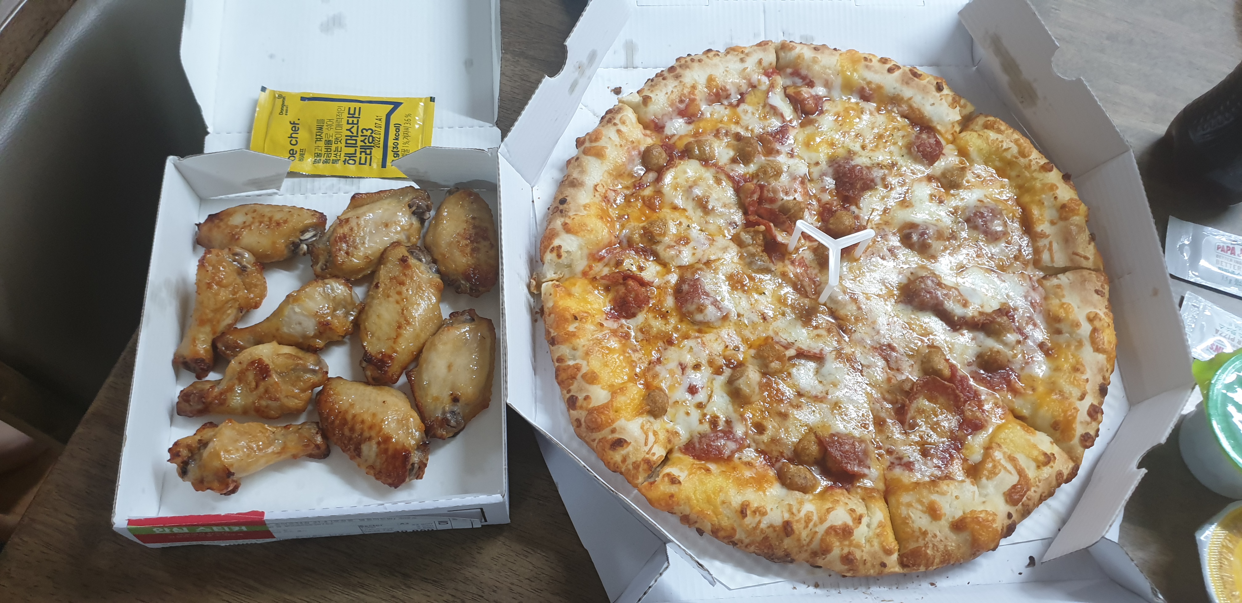 피자는 역시 맛있었습니다. 토핑도 많고 치즈 많아서 좋았어요. 특히 피자 가장자리 치즈롤이 진짜 맛있어서 맘에 들었습니다. 개인적으론 프랜차이즈 피자 중에 파파존스가 제일 맛있는 것 같네요.