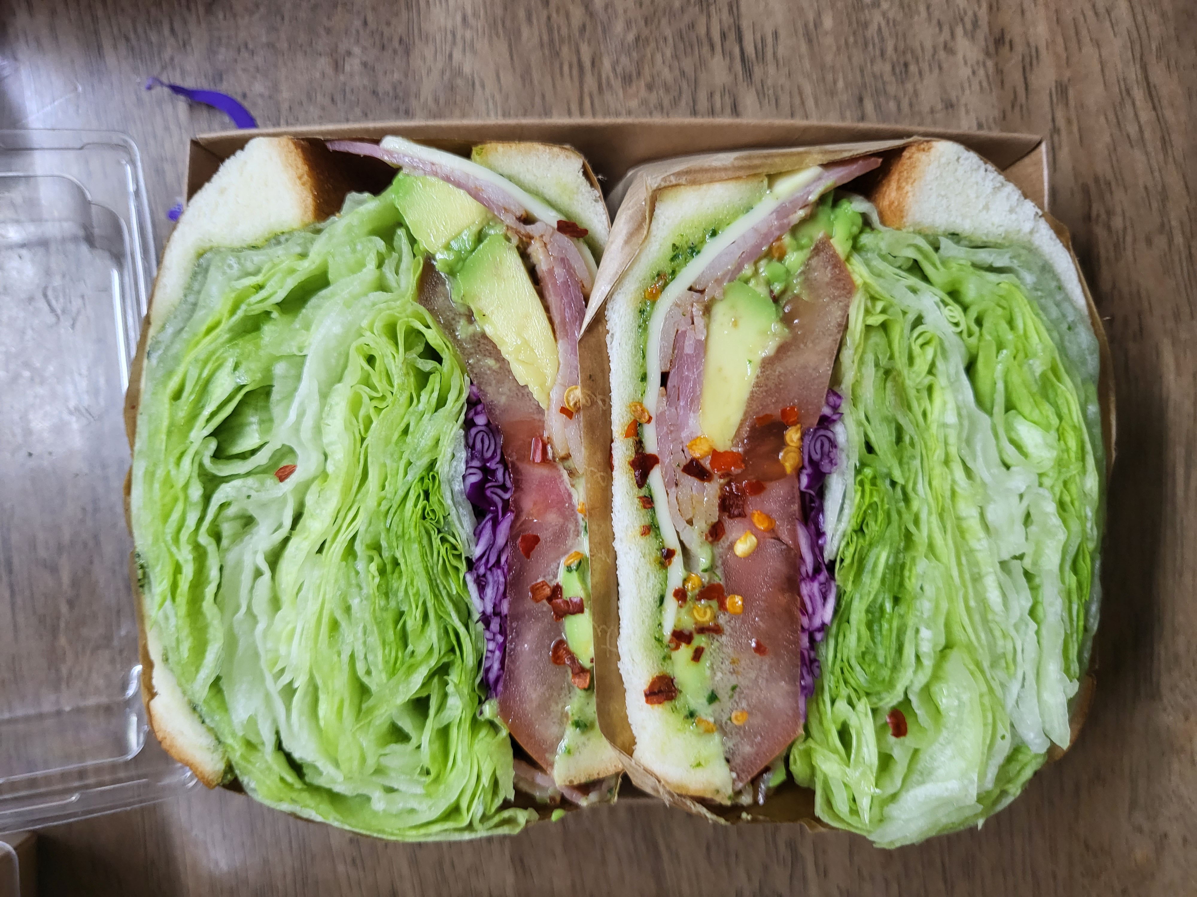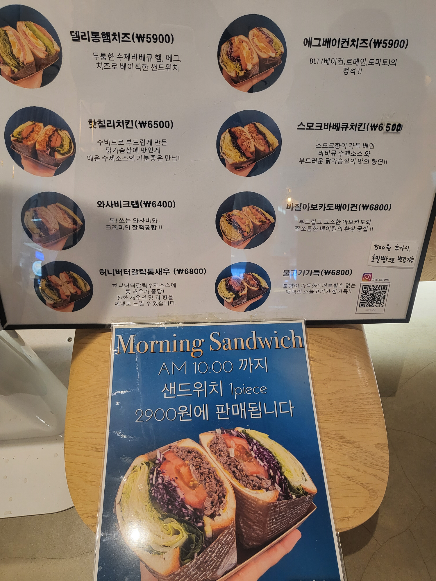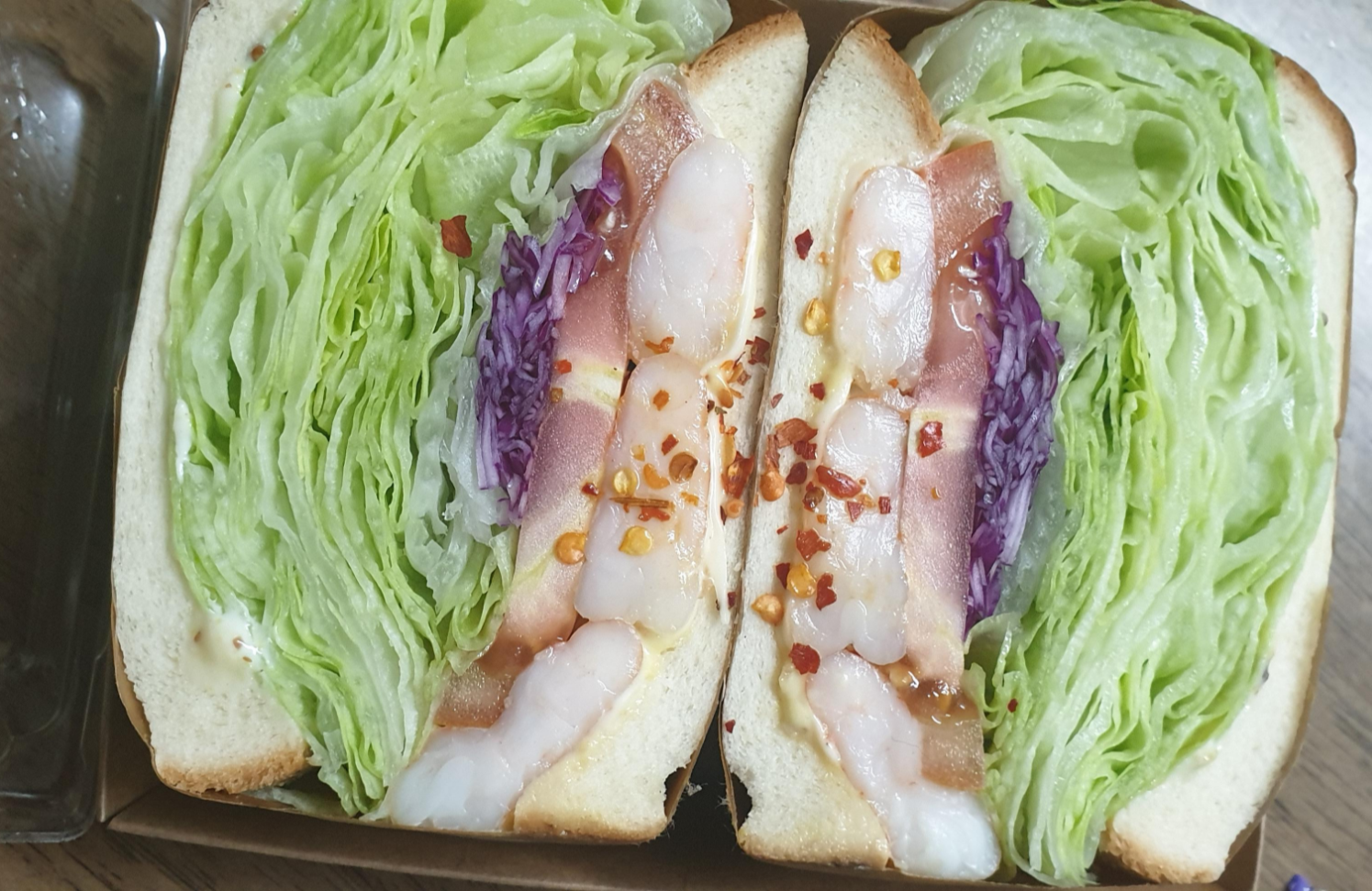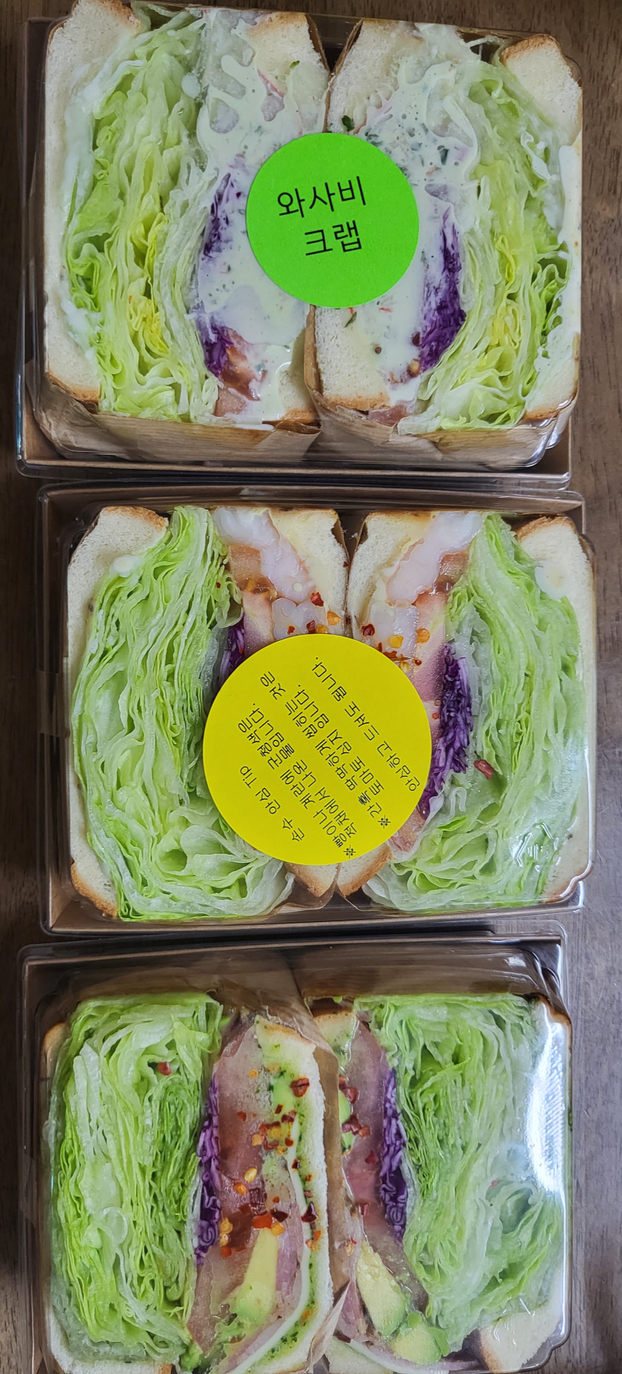 저는 버터 갈릭 통새우 샌드위치(6800원), 바질 아보카도 베이컨 샌드위치(6800원), 와사비 크랩 샌드위치(6400원)를 구매했습니다. 샌드위치가 그냥 봐도 양상추가 엄청 많이 들어있어서 한입에 먹기는 불편할 것 같이 생겼네요.