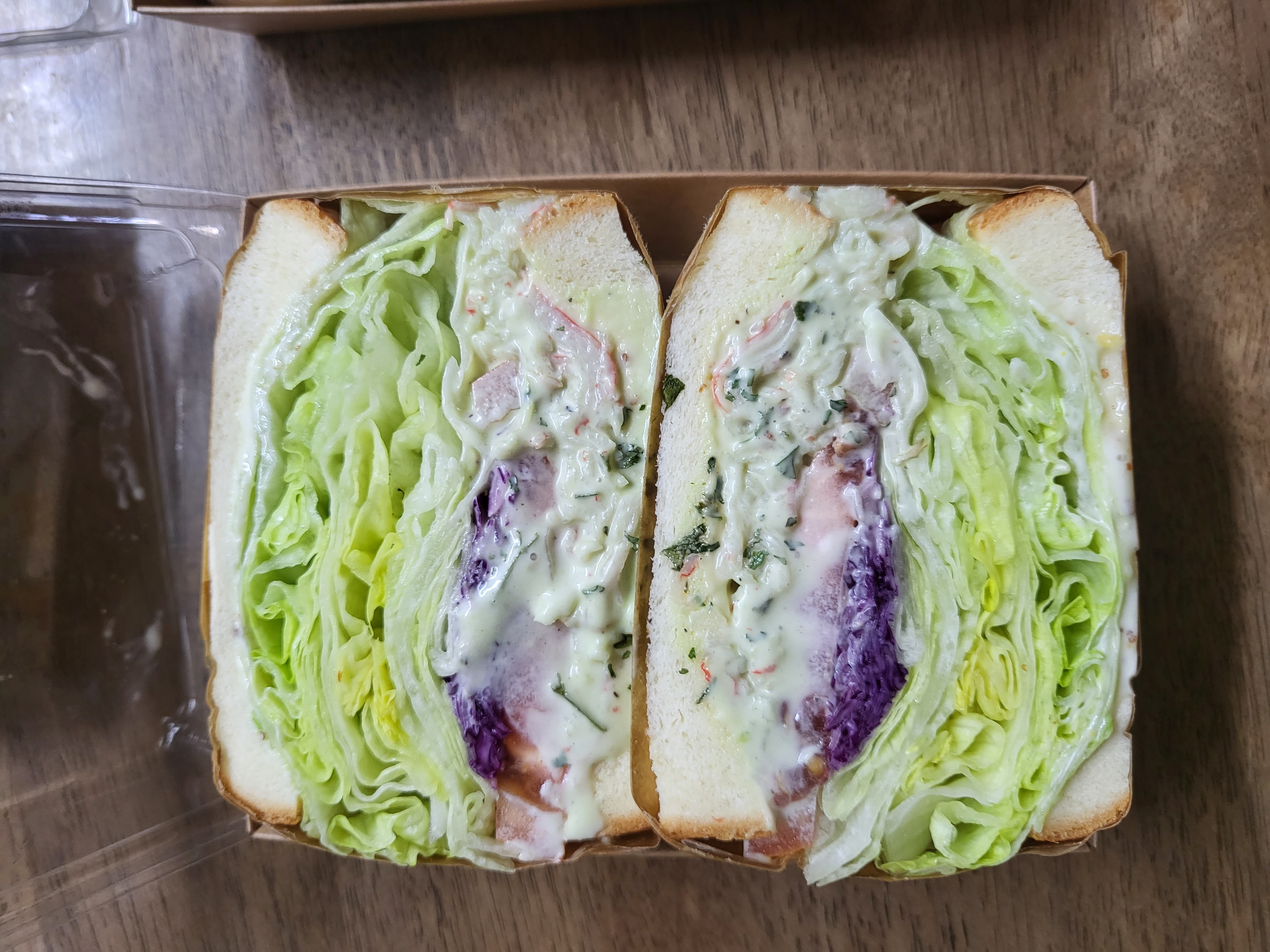 와사비크랩은 흠... 양상추가 두꺼운 부분은 고추냉이가 너무 약하고 아래쪽 가장자리는 와사비가 너무 강해서 코가 매웠습니다. 그리고 양상추가 너무 많으니 크래미는 거의 느껴지지 않아서 실망이었어요. 개인적으론 3가지 샌드위치중엔 제일 별로 였습니다. 양상추가 샌드위치 아래쪽에도 고르게 분포되었다면 다르게 느꼈을 것 같네요.