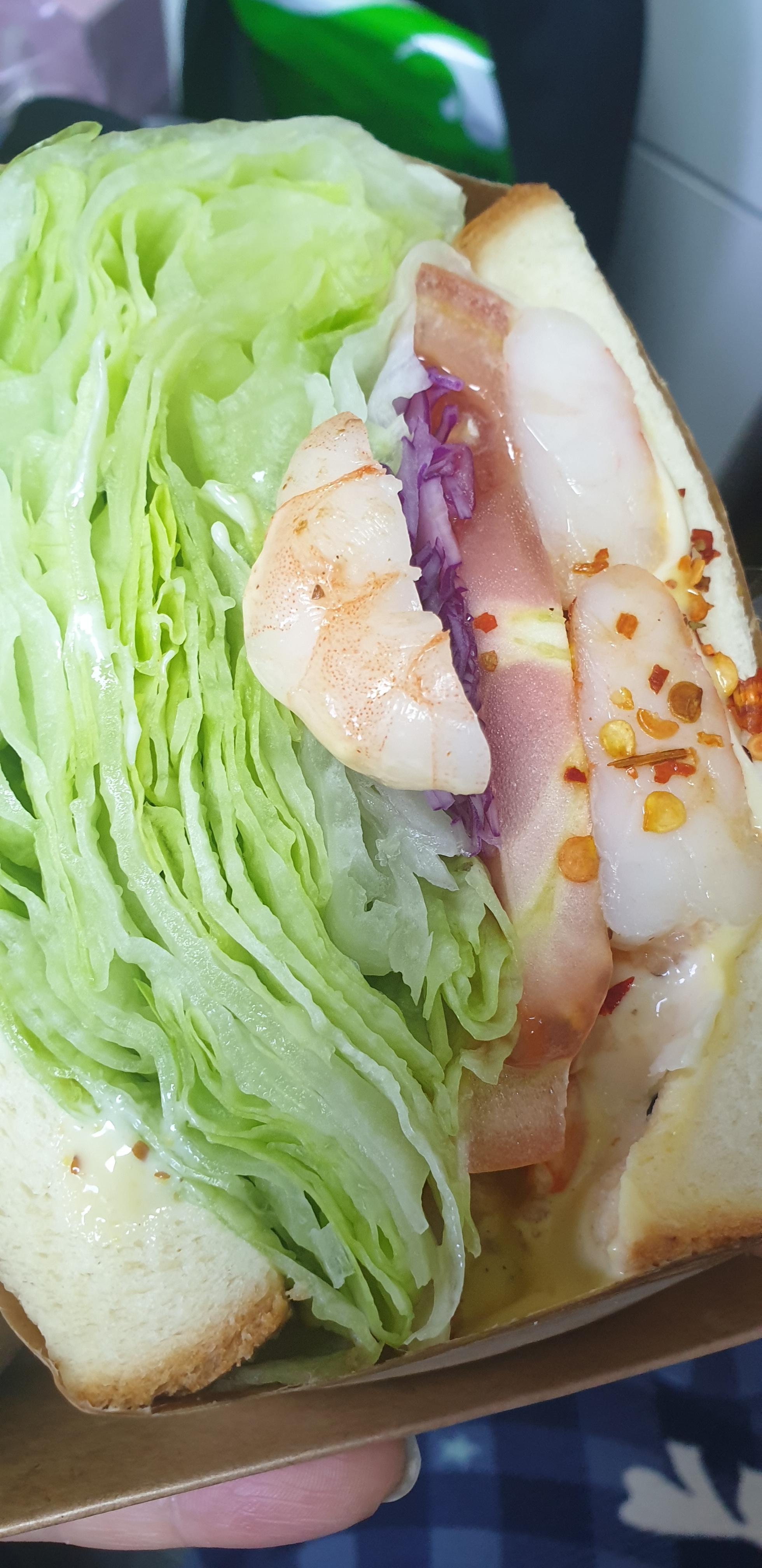 버터 갈릭 통새우 샌드위치는 이번 샌드위치 3개 중에 제일 맛있었습니다. 일단 샌드위치 한쪽당 새우도 4~5마리 정도인 것 같은데 후추 간 같은 게 돼있는 건지 양상추랑 같이 먹어도 새우맛이 느껴져서 좋았습니다.