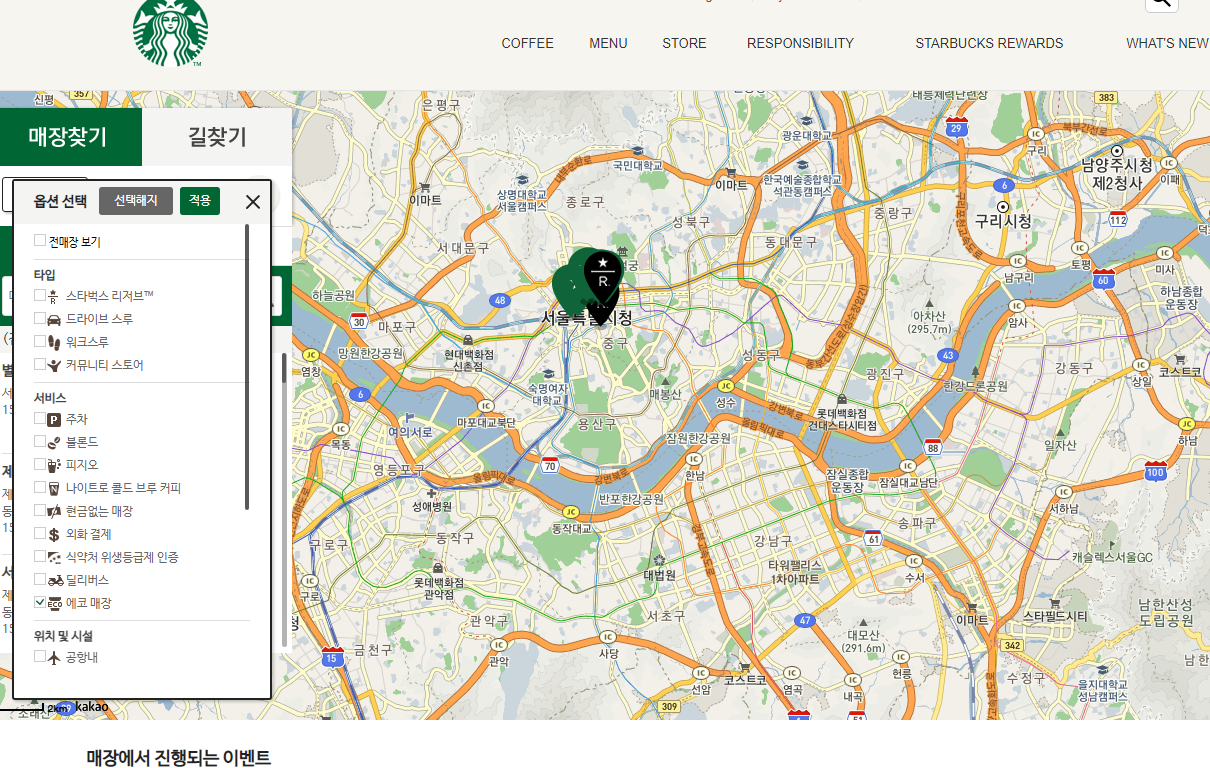 스타벅스 홈페이지에서 매장찾기에서 에코매장만 나오도록 조회를 해보니...