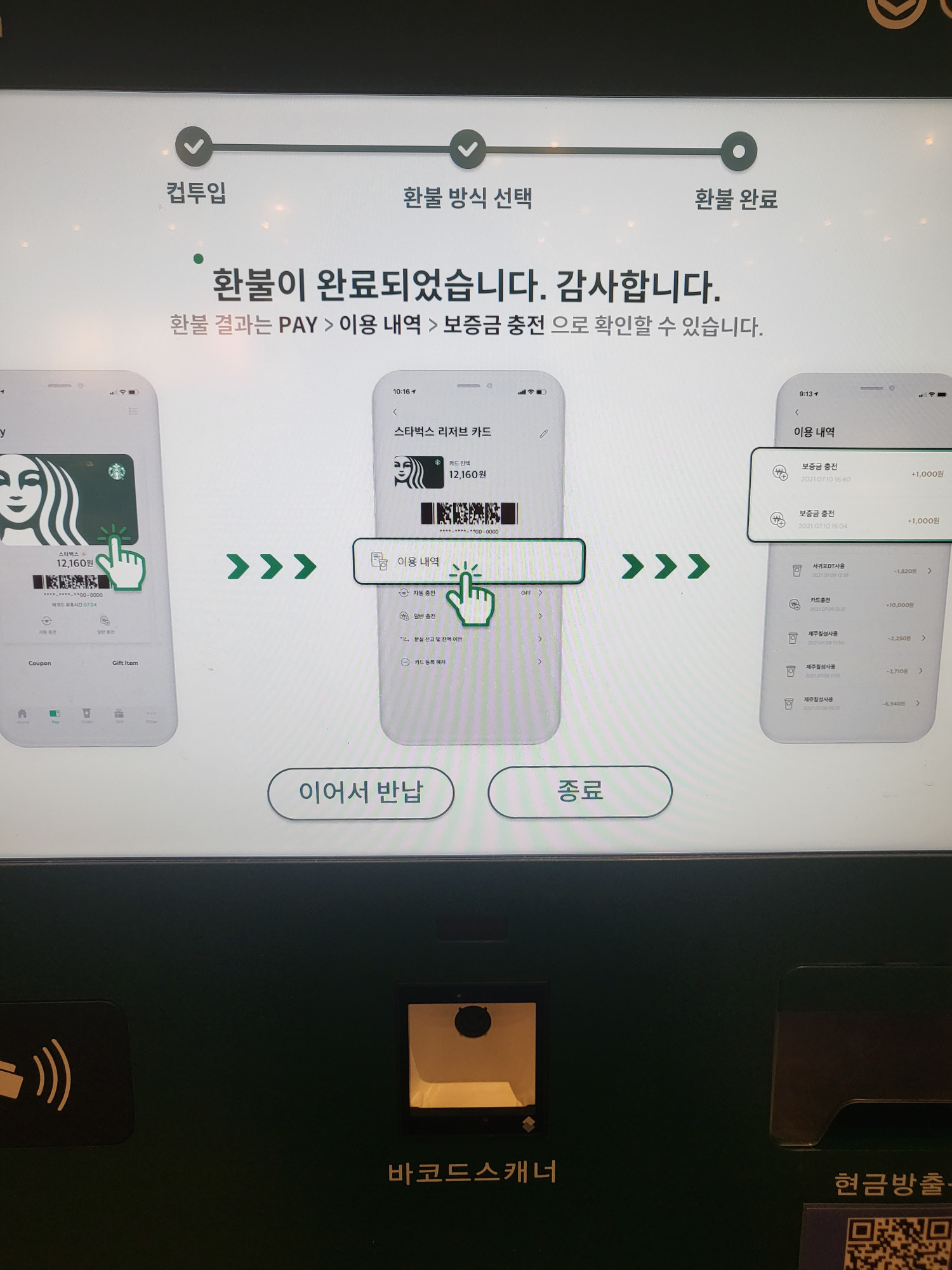 리유저블 컵을 반납할 때는 꼭 세척이 된 상태로 반납해야 합니다. 컵에 종이는 제거하고 반납기에 컵을 넣으면 컵을 확인 후 환불 방식을 선택합니다. 환불 방식은 저는 스타벅스 카드로 선택했습니다.