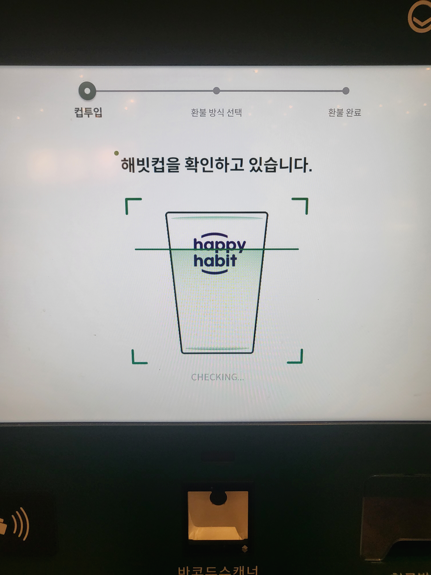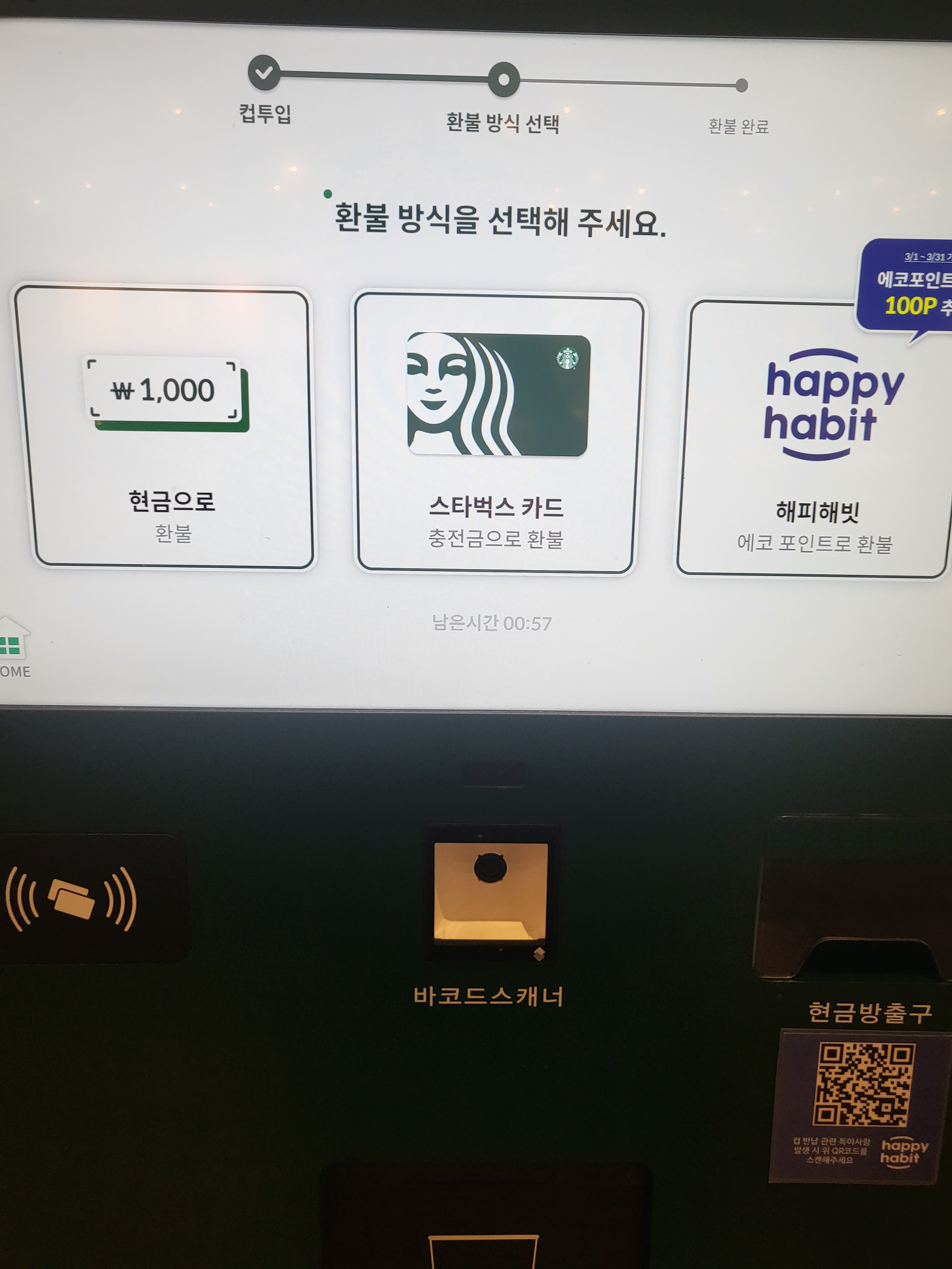 리유저블 컵을 반납할 때는 꼭 세척이 된 상태로 반납해야 합니다. 컵에 종이는 제거하고 반납기에 컵을 넣으면 컵을 확인 후 환불 방식을 선택합니다. 환불 방식은 저는 스타벅스 카드로 선택했습니다.