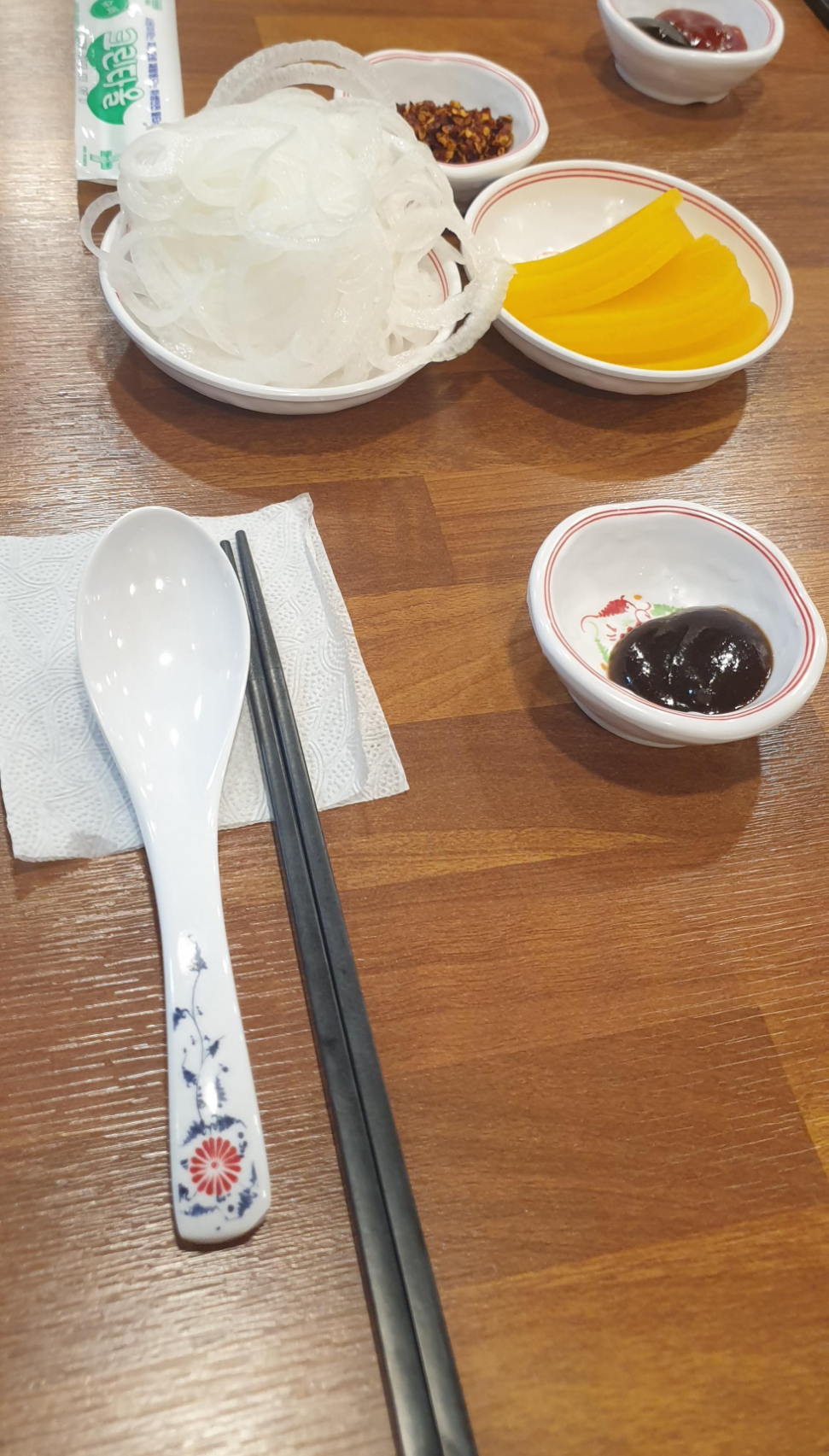 수저 젓가락과 고수, 김치, 단무지, 양파, 소스 등은 셀프바에 구비되어 있습니다.