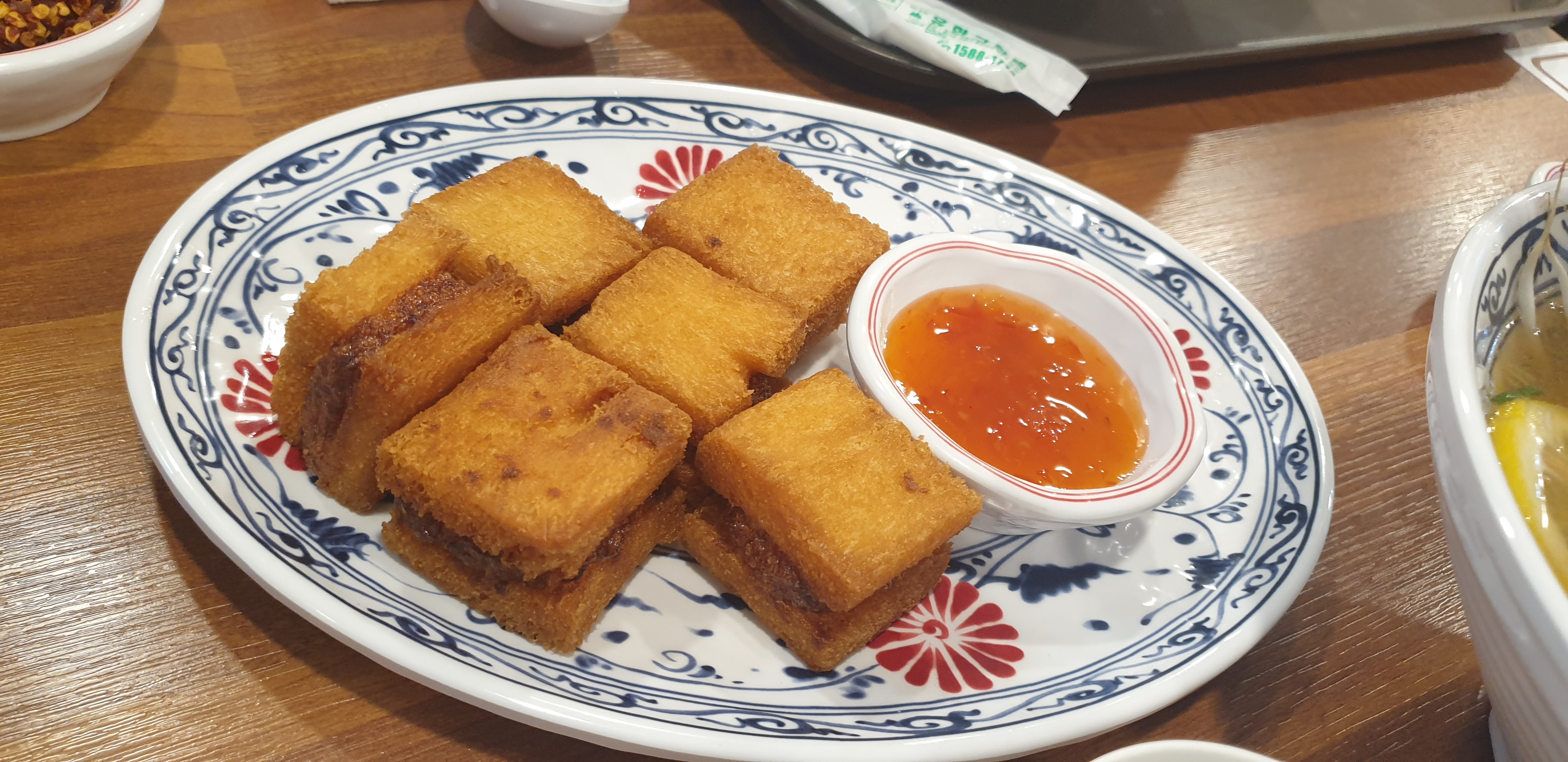 칠리소스와 같이 멘보샤는 6조각이 나왔네요. 멘보샤 안에 새우가 들어있고 생각보다는 맛있게 먹었습니다. 다진 새우만 있는 게 아니라 새우맛도 꽤 난 것 같아요.