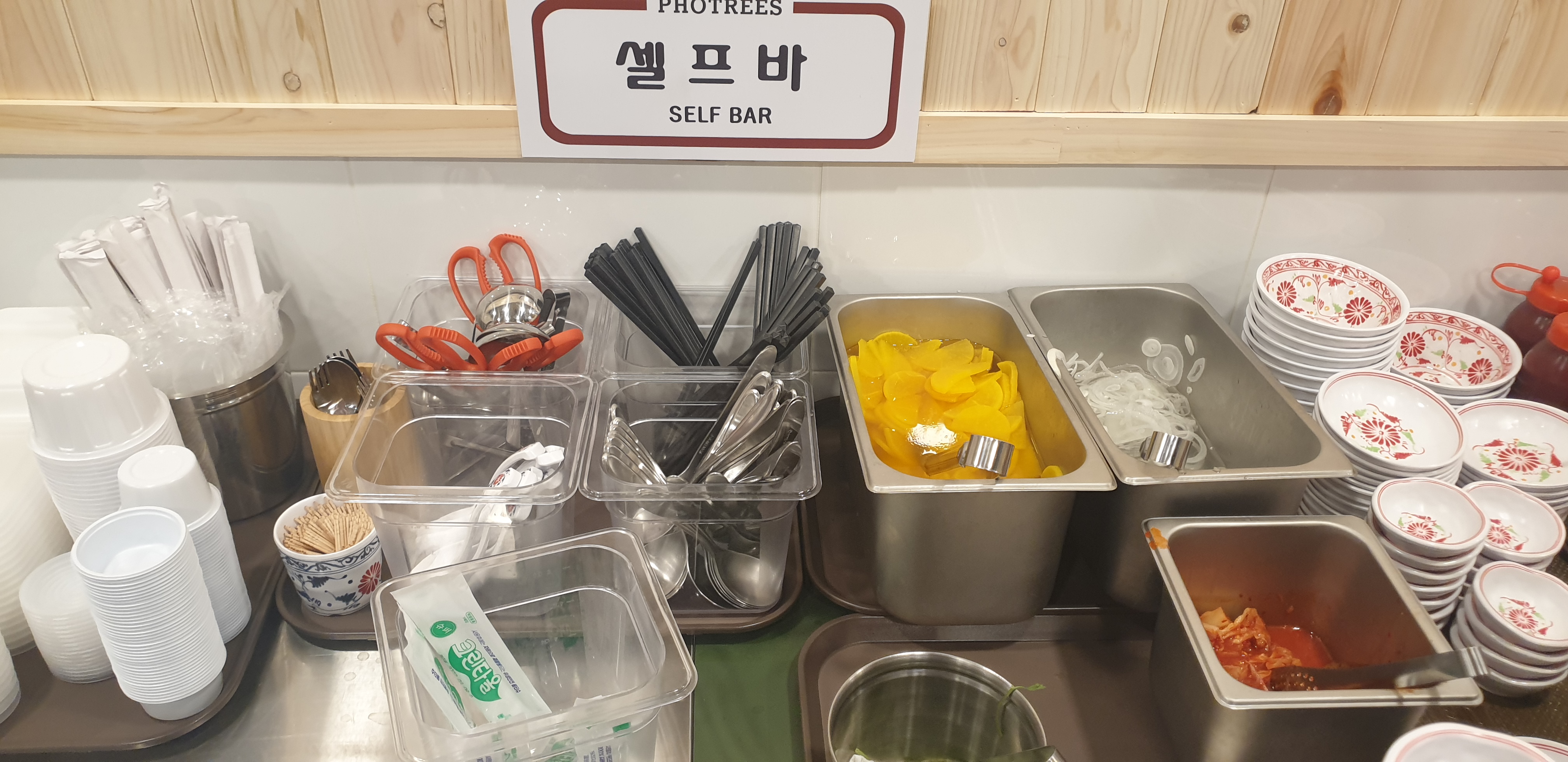 수저 젓가락과 고수, 김치, 단무지, 양파, 소스 등은 셀프바에 구비되어 있습니다.