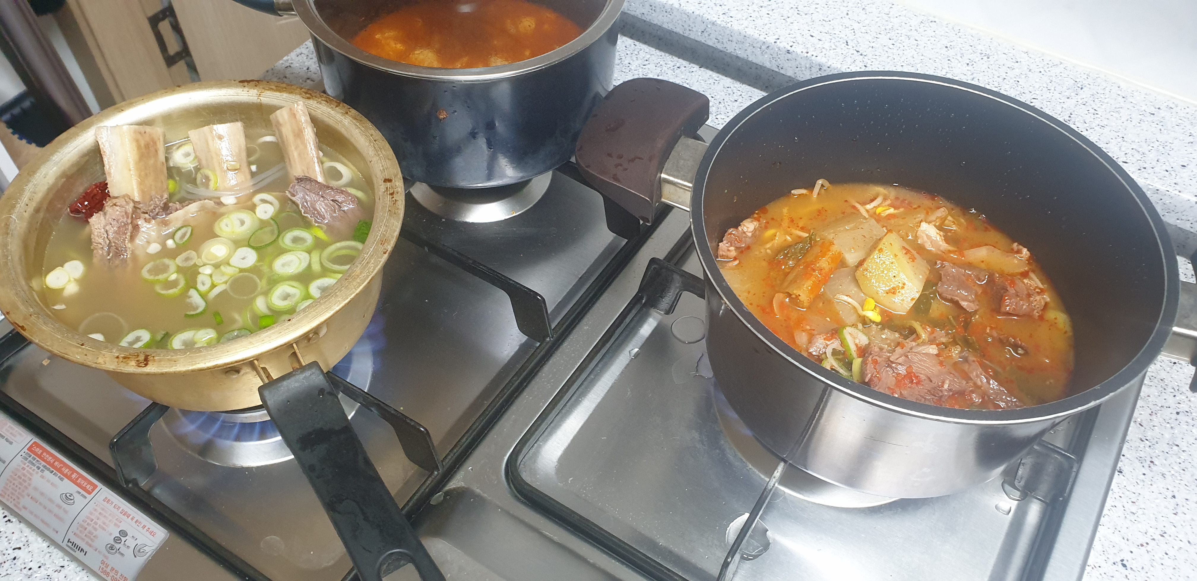 집에서 국들을 한 번씩 데워먹기로 하고 냄비에 옮겨서 데웠습니다.