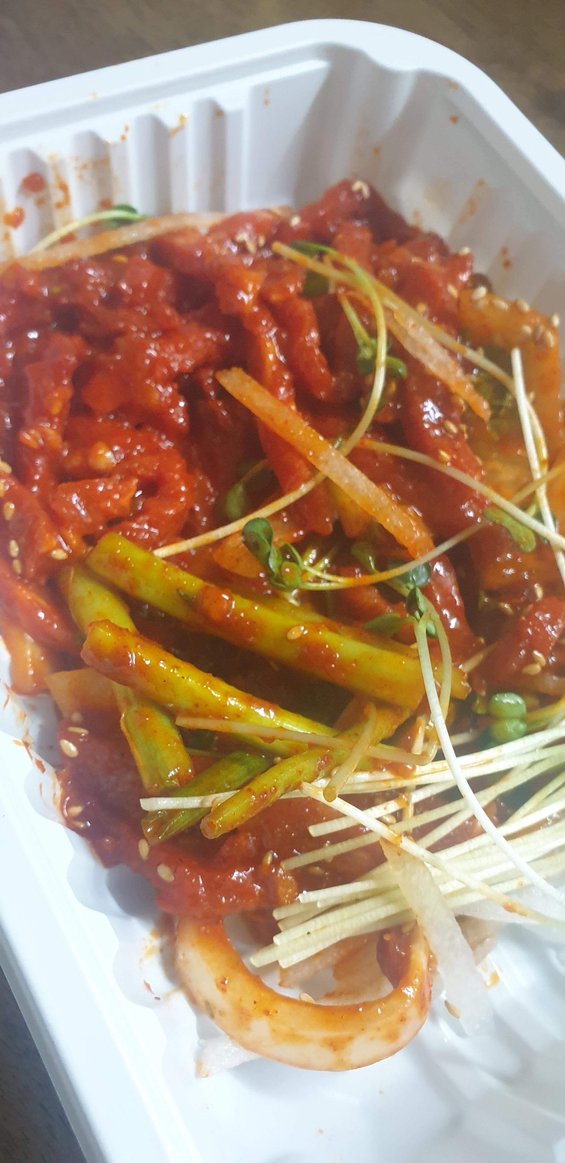 고추장 육회는 아래 고기 아래 미나리가 있고 배랑 무순이 조금 있네요.