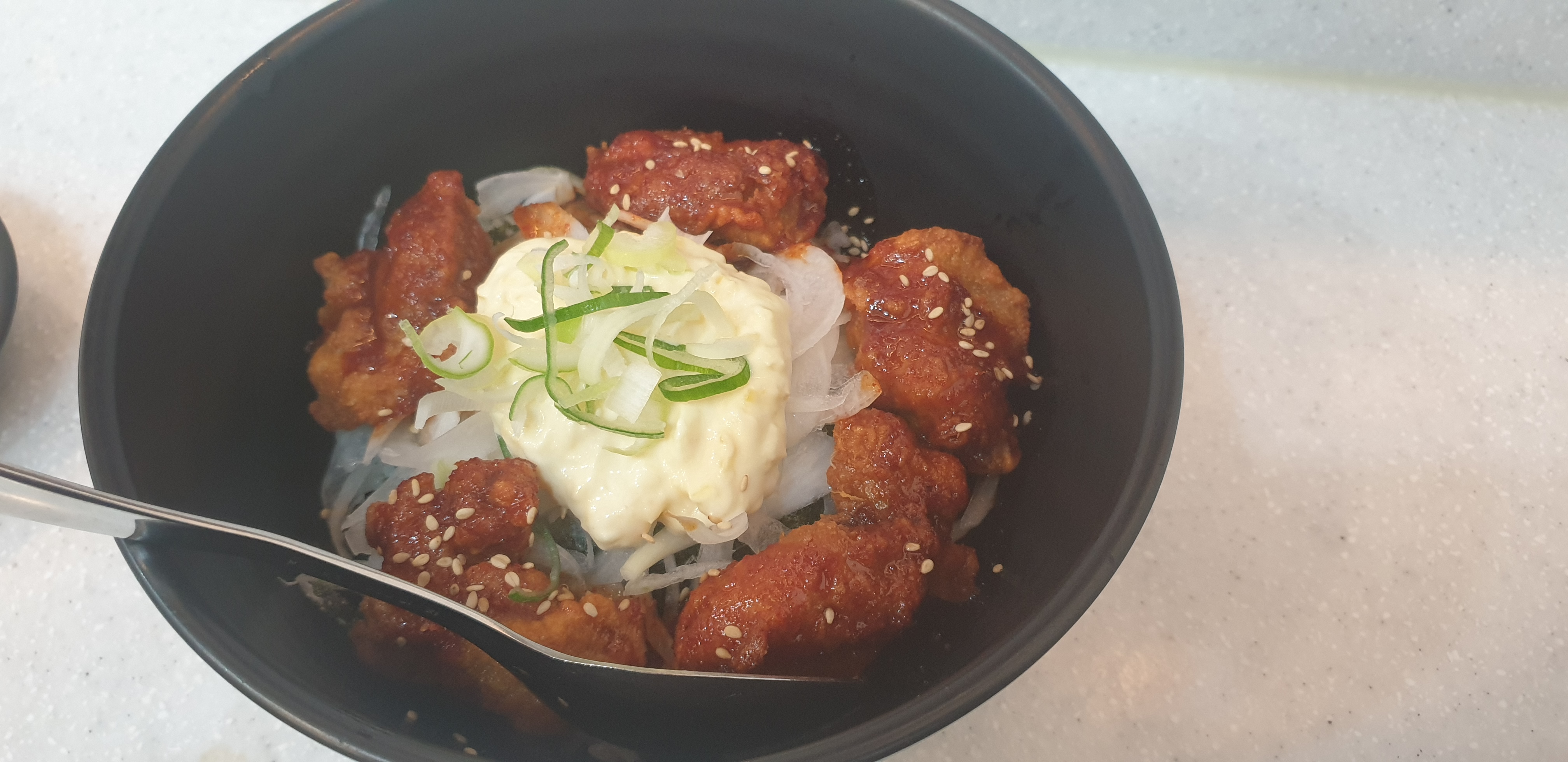 우동 먹으려고 들어갔다가 매콤치킨마요 덮밥이라는 메뉴를 보고 끌리듯 주문했습니다.