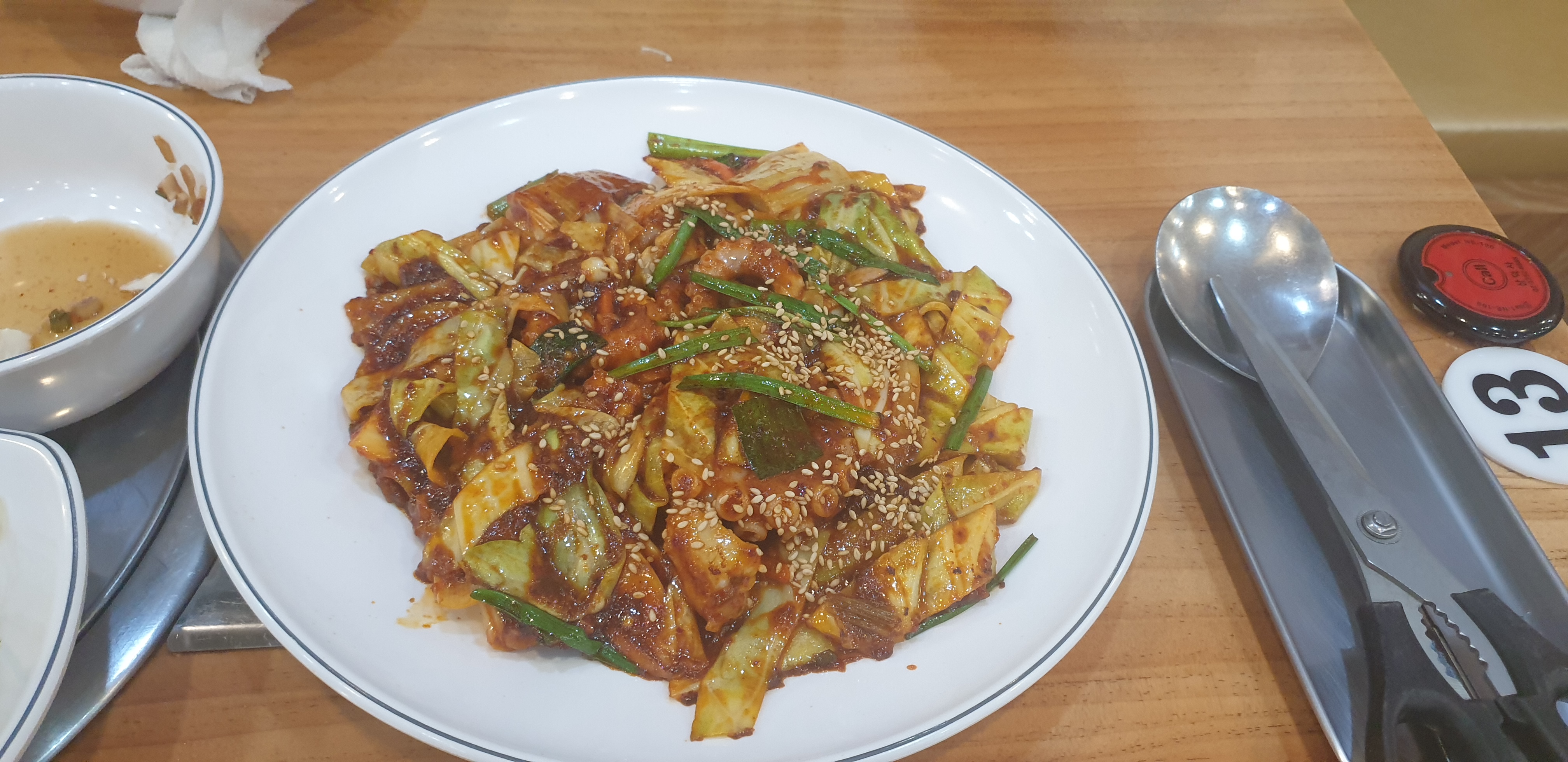 맵기는 적당히 매웠습니다. 다른 낙지볶음이나 쭈꾸미 집보다는 안 매웠지만 매운 거 잘못 드시는 분들에겐 매울 것 같았습니다. 야채는 아삭아삭했어요. 낙지는 흠... 개인적으론 2인분 치고는 적었던 것 같습니다.