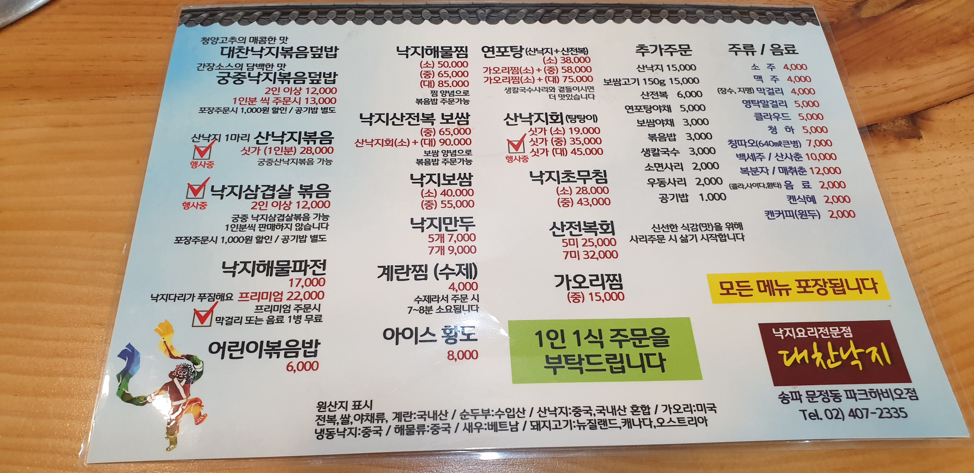 산 낙지볶음은 할인 이벤트를 하는 것 같은데 메뉴판에 표시는 안 돼있네요. 저는 대찬낙지볶음덮밥 2인분(24,000원)을 주문했습니다.