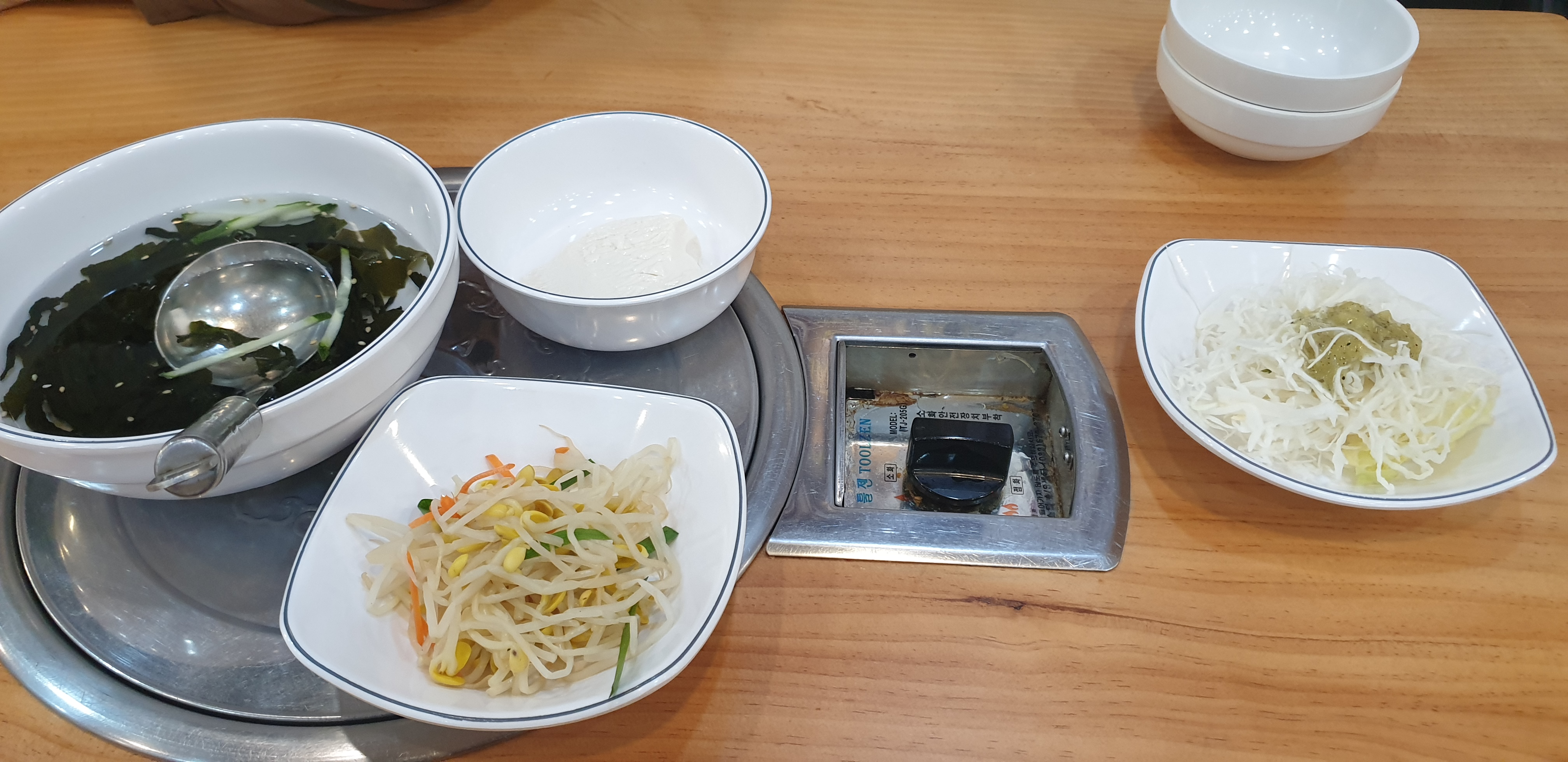 밑반찬은 냉국, 콩나물, 순두부, 샐러드가 나옵니다.
