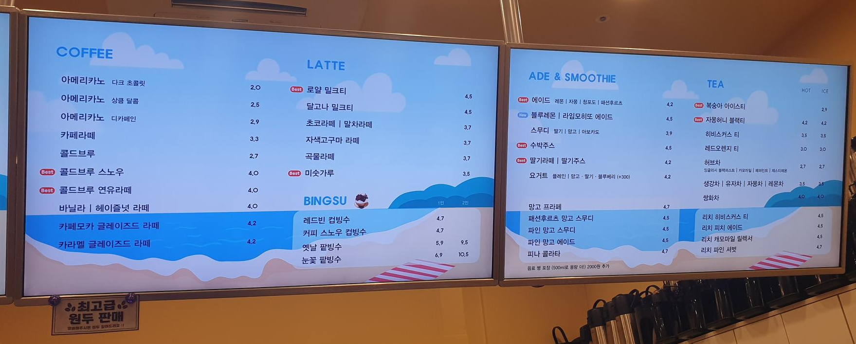 이 날은 커피를 이미 마셔서 구매 안했지만 커피도 팔고 있습니다. 특이하게 아메리카노가 가격이 다르게 3종류네요.