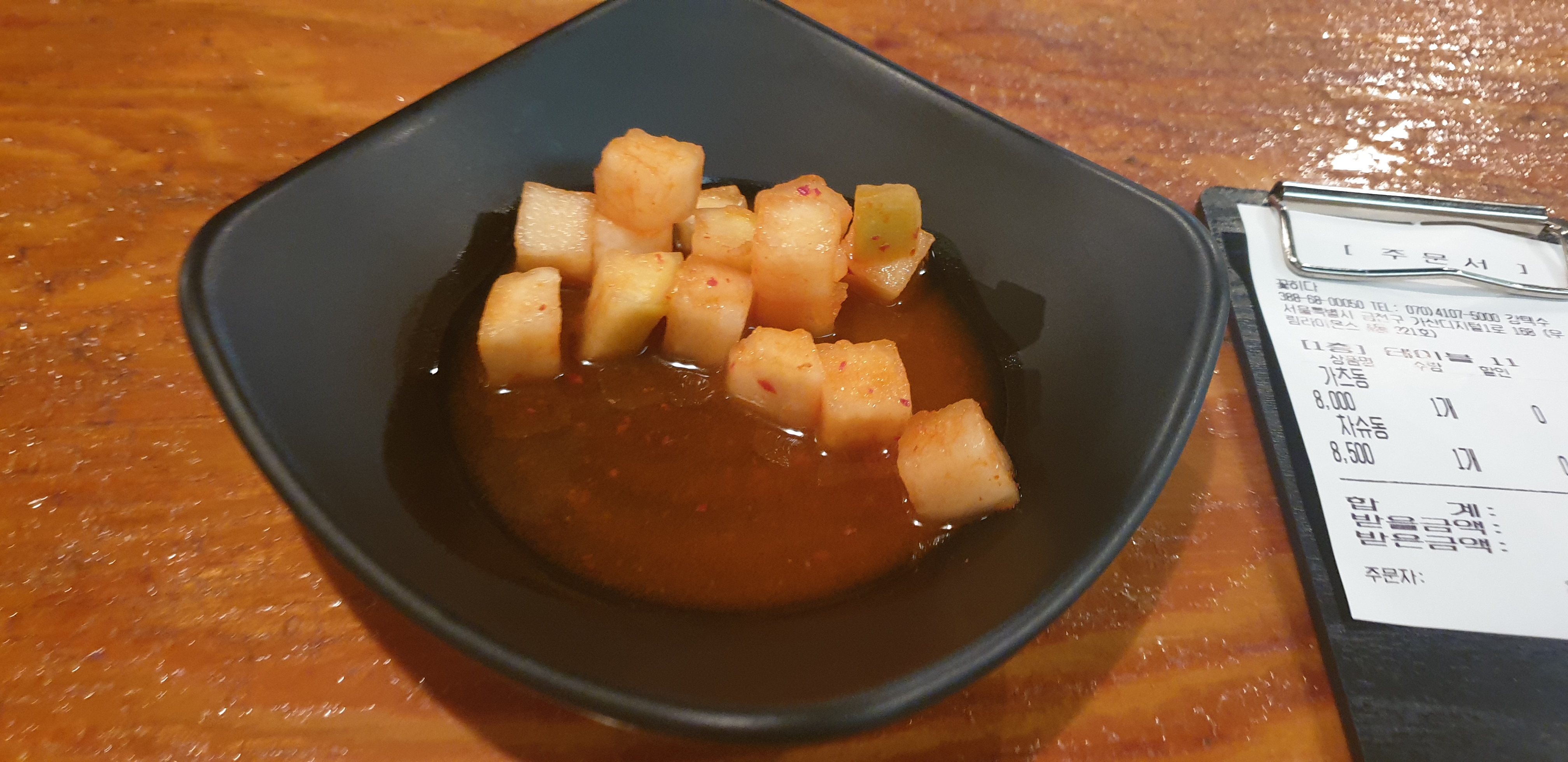 반찬은 깍두기와 테이블에 있는 단무지가 있네요.