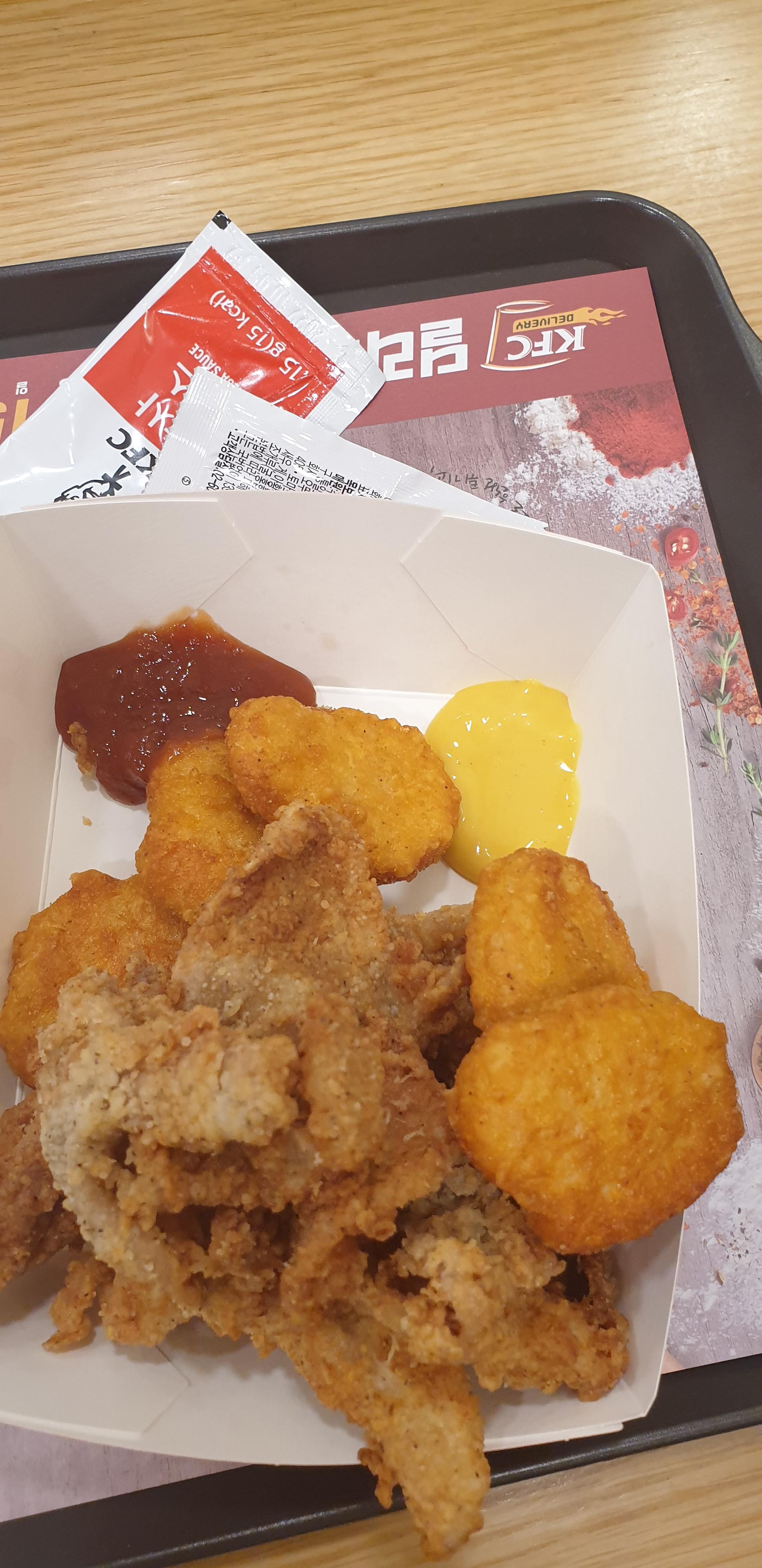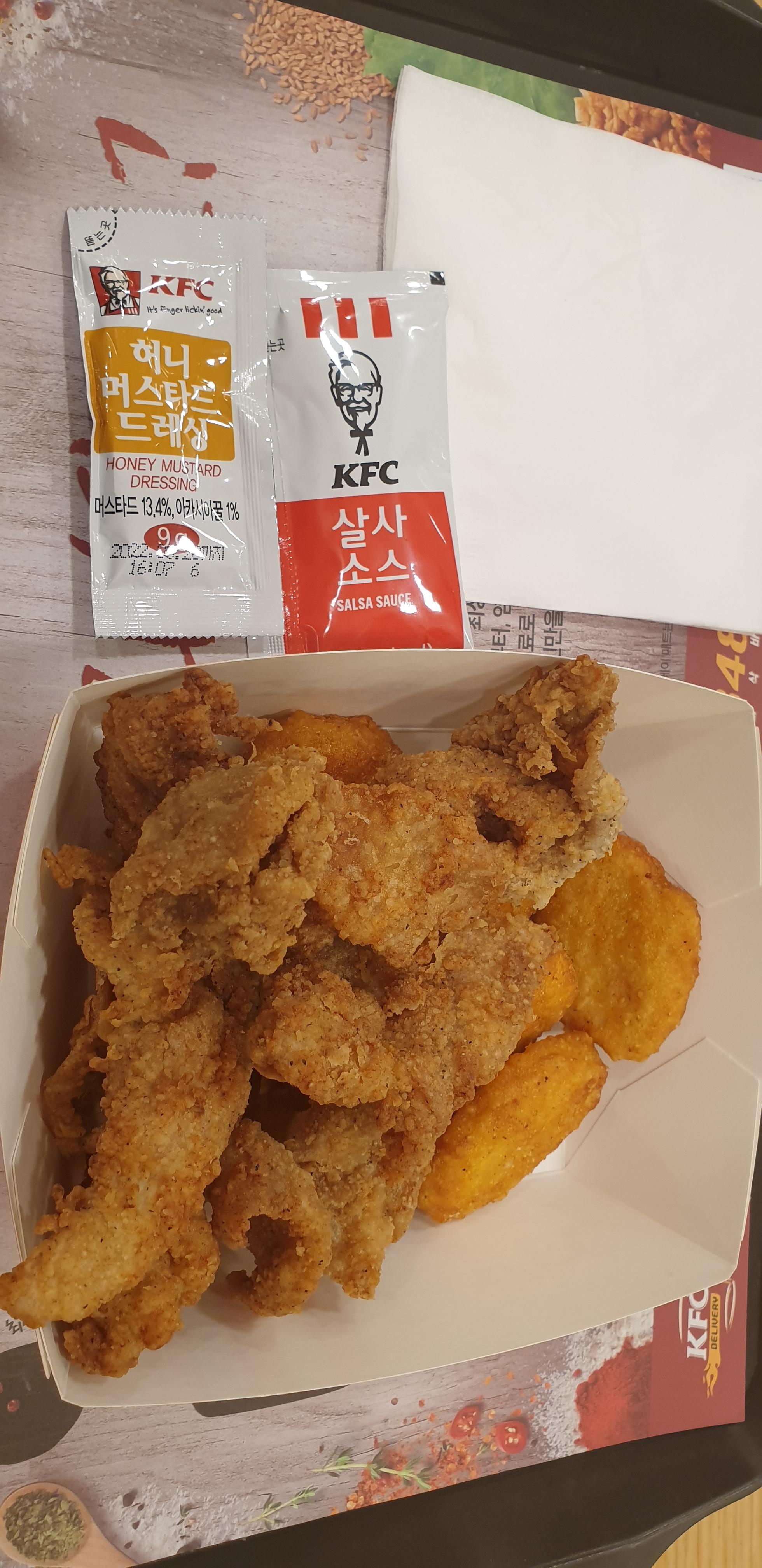 지나가다 본 KFC에서 닭껍질 튀김과 너겟 6개를 4,900원에 팔고 있더군요.