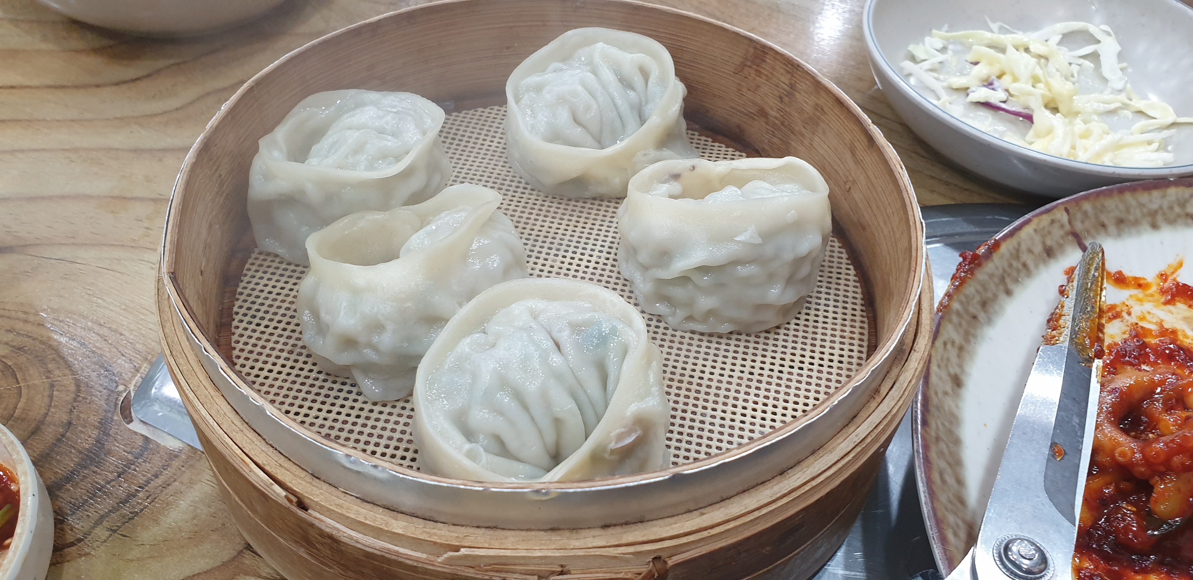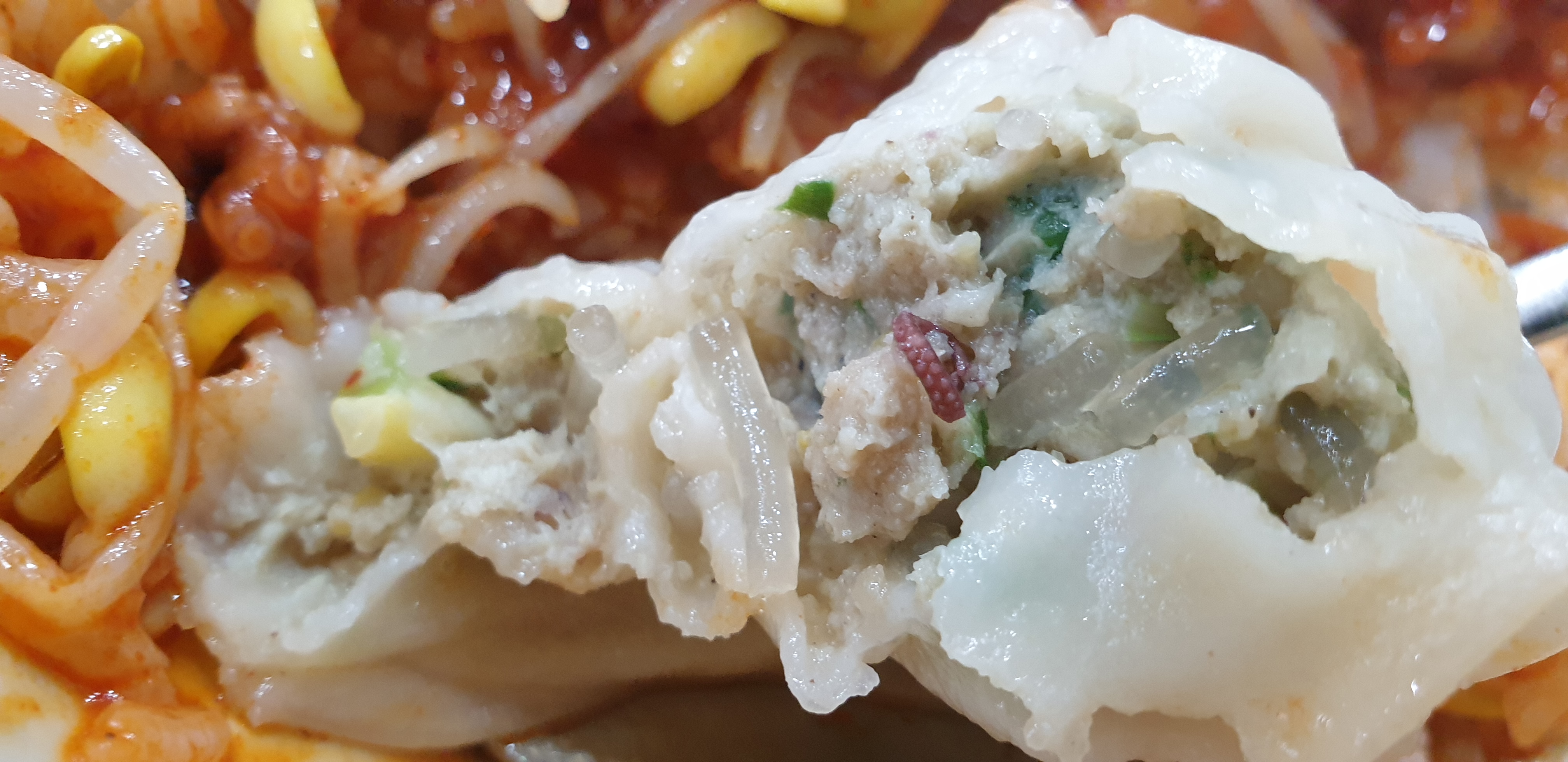 낙지 통만두는 약간 실망이었습니다. 낙지 통만두라는 이름만 보고 마트에 파는 오징어 만두처럼 낙지 씹히는 맛이 있을 줄 알았는데 낙지가 거의 안 느껴집니다. 자세히 보면 가느다란 다리 끝 조금 보이긴 하는데 일반 만두와의 차이를 느낄 순 없었습니다. 그리고 일반적으로 먹는 만두보다도 맛이 별로였던 것 같습니다.