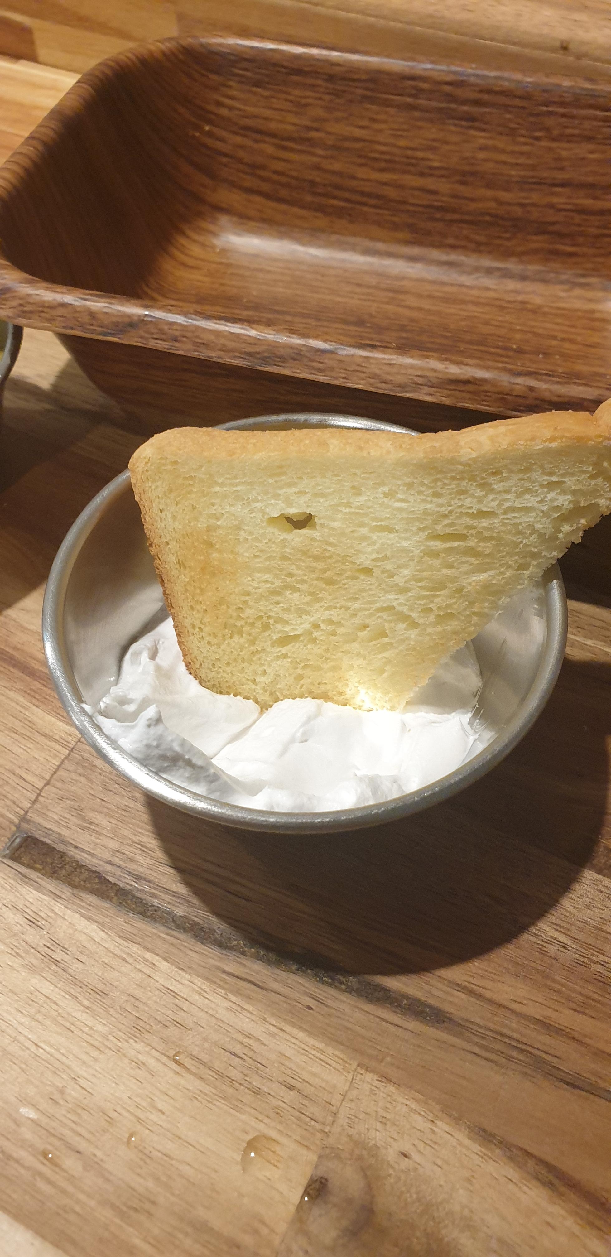 반찬? 식전 빵?으로 토스트기로 구운 식빵과 생크림이 나오는데 생크림이 엄청 맛있었어요.